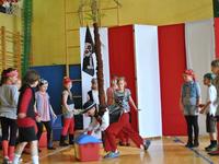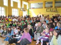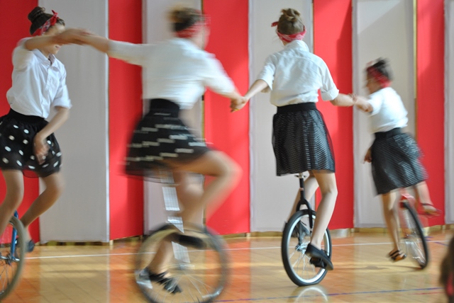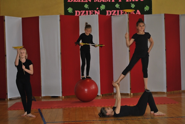 A na zakończenie w sali gimnastycznej wystąpiła grupa cyrkowo-akrobatyczna z udziałem naszych uczniów. Grupa przygotowana przez Panią Ewę Pręgowską wprawiła w zachwyt publiczność, która mogła zobaczyć trudne układy akrobatyczne, jazdę na monocyklu, elementy żonglerki i wiele innych.