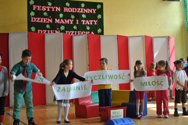 Następnie uczniowie klasy IIa i II c przygotowani przez mgr Ewę Franusik-Schastok oraz mgr Monikę Diurczak poprzez pantomimę pokazali ważne wartości dla każdej rodziny: miłość, zaufanie i życzliwość.Kolejny ciekawy występ w języku angielskim przedstawili uczniowie klasy IIb, przygotowani przez mgr Renatę Żemełko.