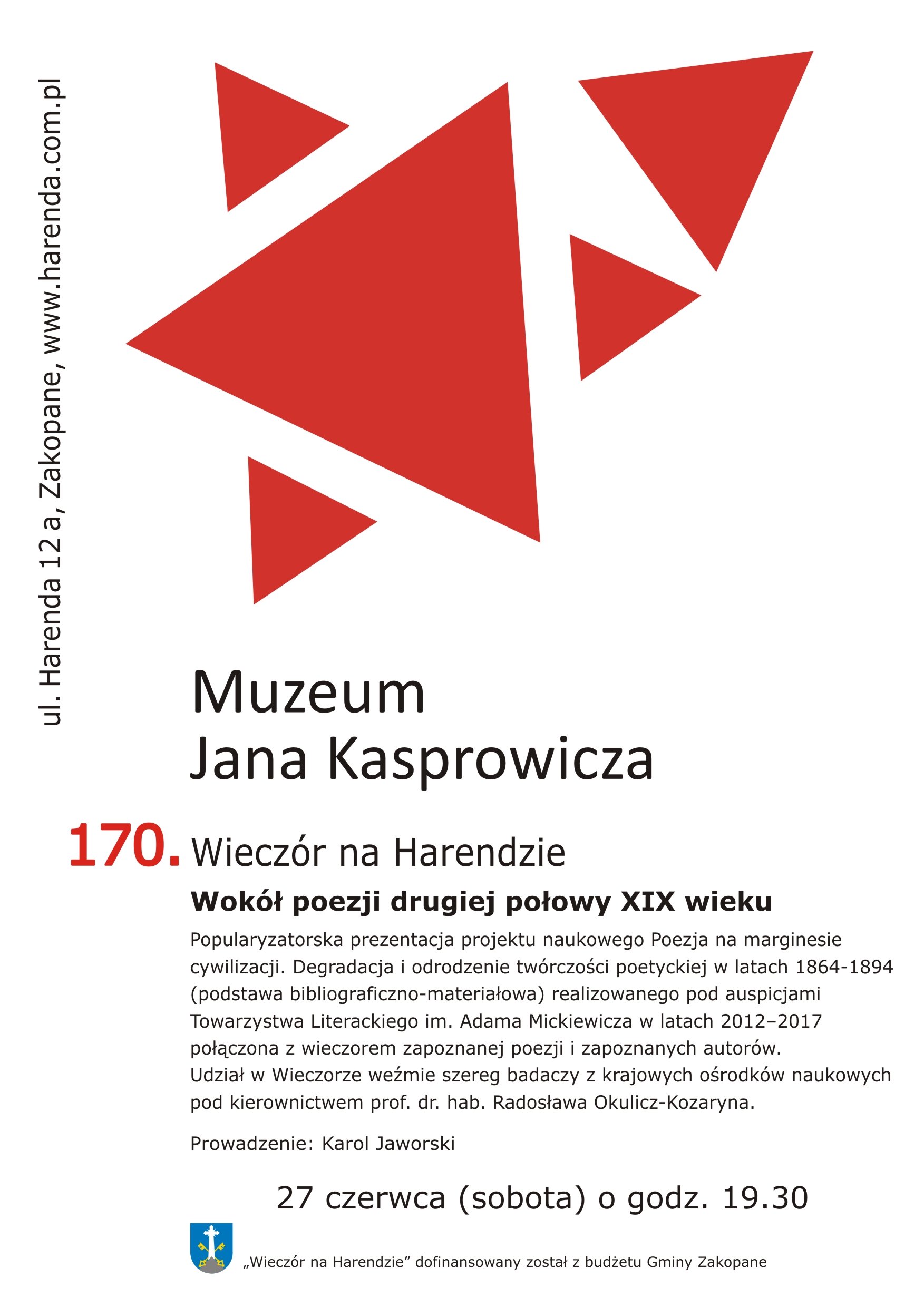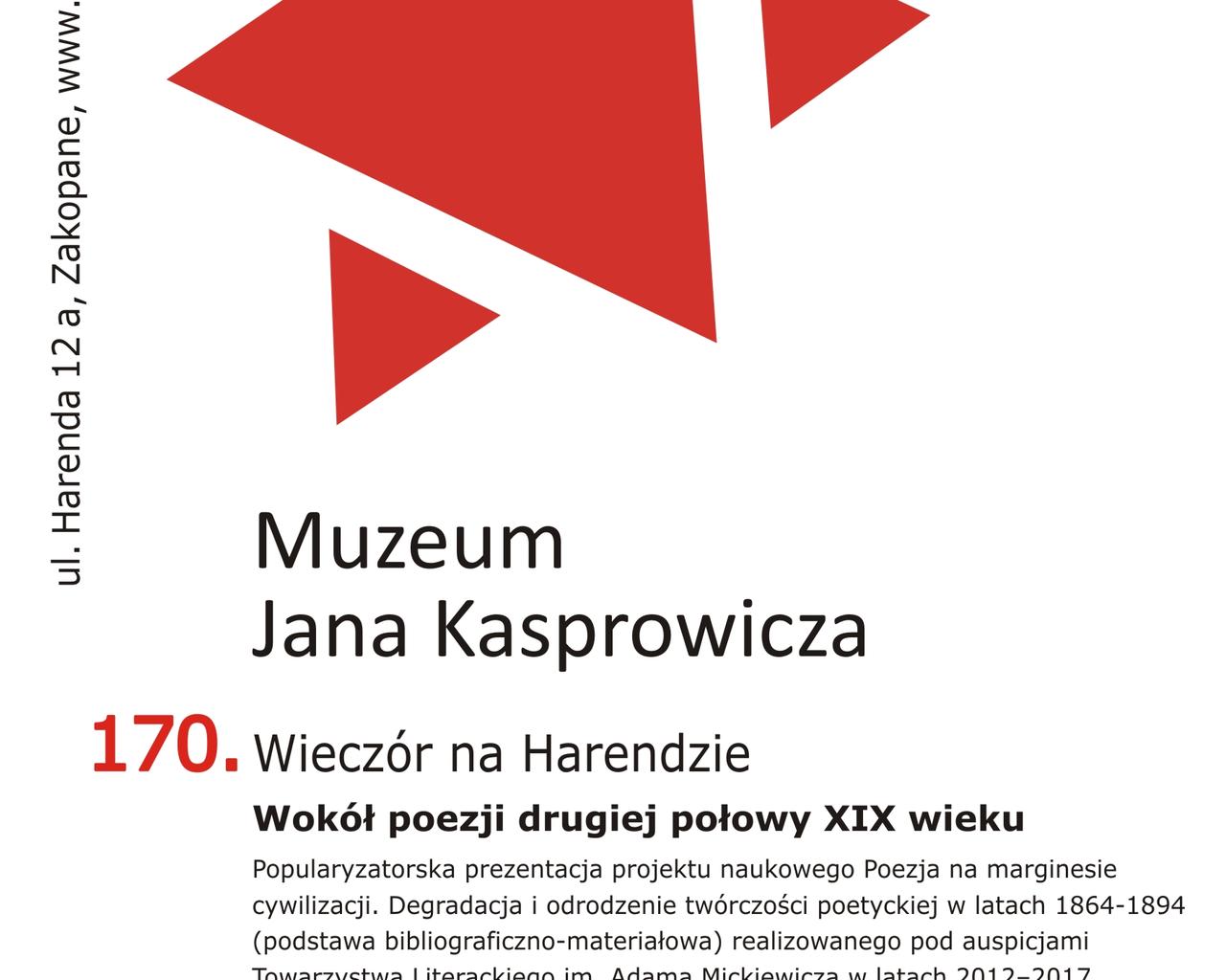Stowarzyszenie Przyjaciół Twórczości Jana Kasprowicza zaprasza na kolejny "Wieczór na Harendzie" do Muzeum Jana Kasprowicza, Zakopane Harenda 12 a, 27 czerwca (sobota) 2015 r. o godz. 19.30 „Wokół poezji drugiej połowy XIX wieku”.