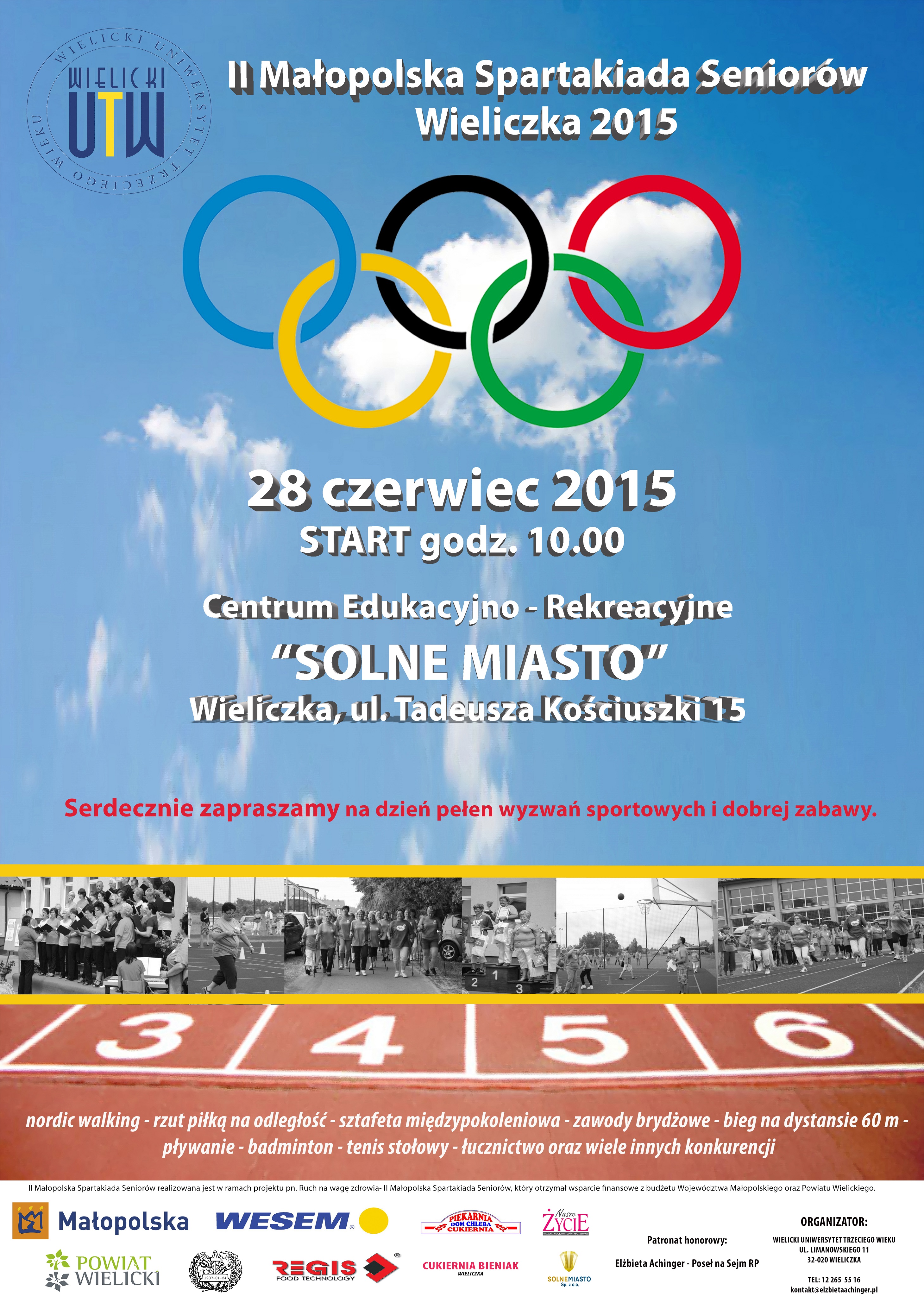 Członkowie Stowarzyszenia Wielicki Uniwersytet Trzeciego Wieku zapraszają do udziału w II Małopolskiej Spartakiadzie Seniorów, która odbędzie się 28 czerwca 2015 r. w Centrum Edukacyjno-Rekreacyjnym „Solne Miasto”. Na uczestników czeka dzień pełen wyzwań sportowych i dobrej zabawy.