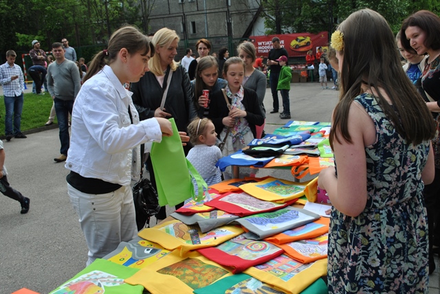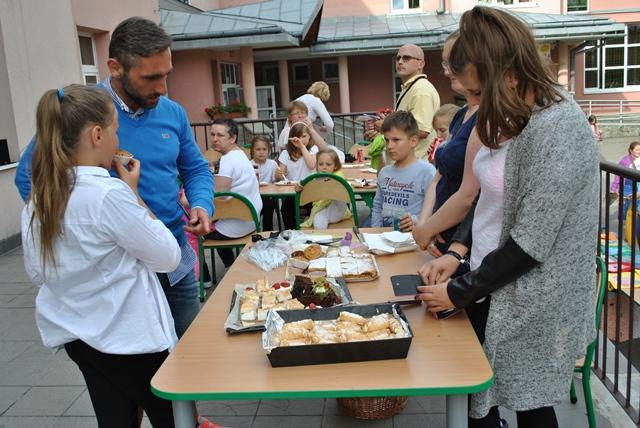 Wiele działo się również na zewnątrz i w murach szkoły. Pani Anna Stawarz wraz z uczniami przygotowała kiermasz prac plastycznych. Pani Agnieszka Wrona przeprowadziła konkurs piosenki. Na tarasie i korytarzu grała muzyka, a prowadzącymi byli nasi uczniowie. Wielkim wyzwaniem i sukcesem okazało się przygotowanie setek zdrowych kanapek i owoców, którymi częstowano wszystkich uczestników festynu. Rodzice przygotowali smaczną kiełbaskę z grilla. A na placu przy szkole sprzęt prezentowała Policja z Zakopanego, a swoje stoisko z klockami Lego miała firma Shell. Na boisku szkolnym trwały testy sprawnościowe i uczniowie oraz rodzice mogli spróbować swoich sił w grach sportowych, organizowanych przez Pana Andrzeja Skrobota i Panią Monikę Diurczak. Był to bardzo miły czas i okazja do wielu rozmów w rodzinnym i szkolnym gronie.