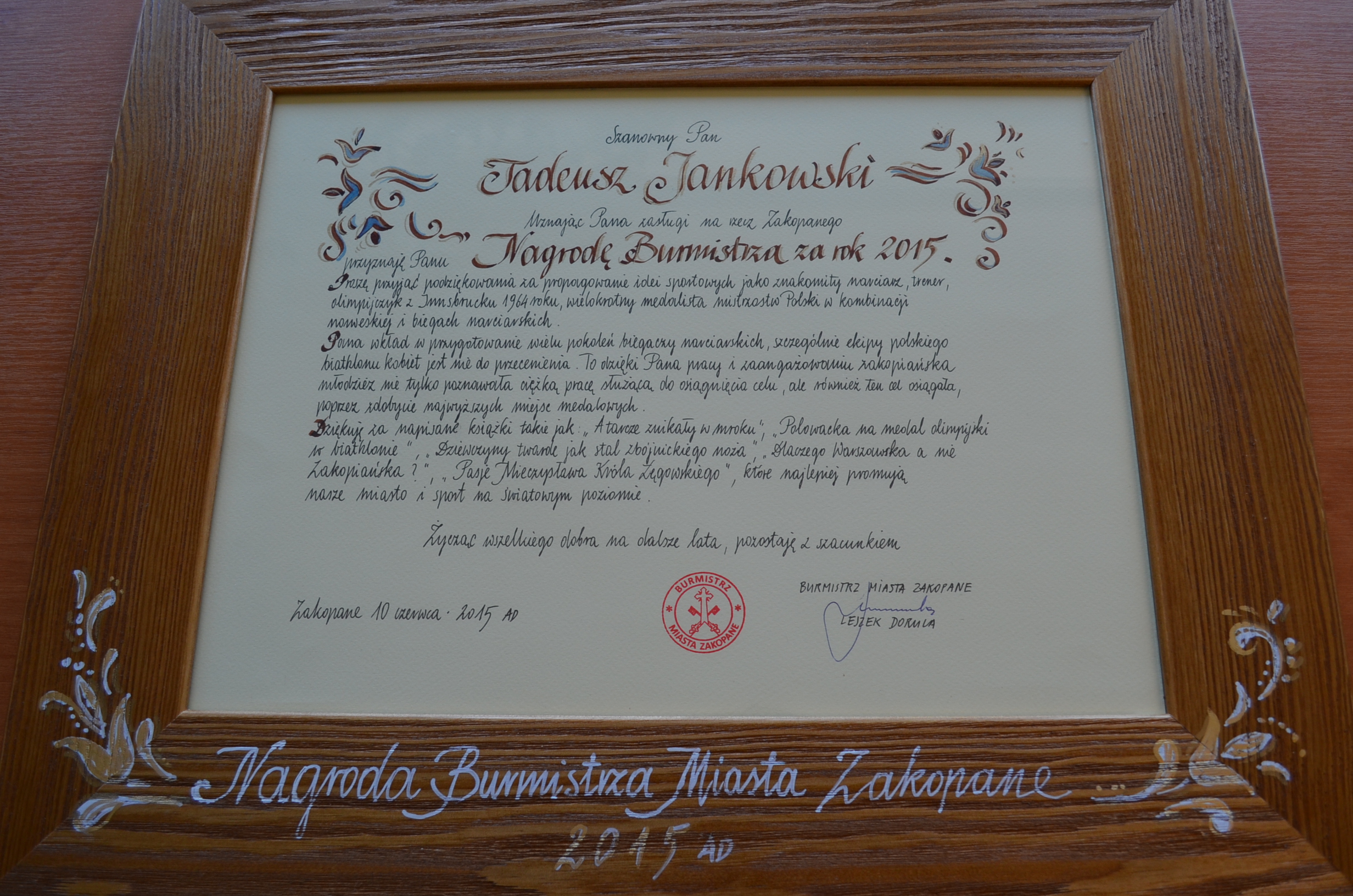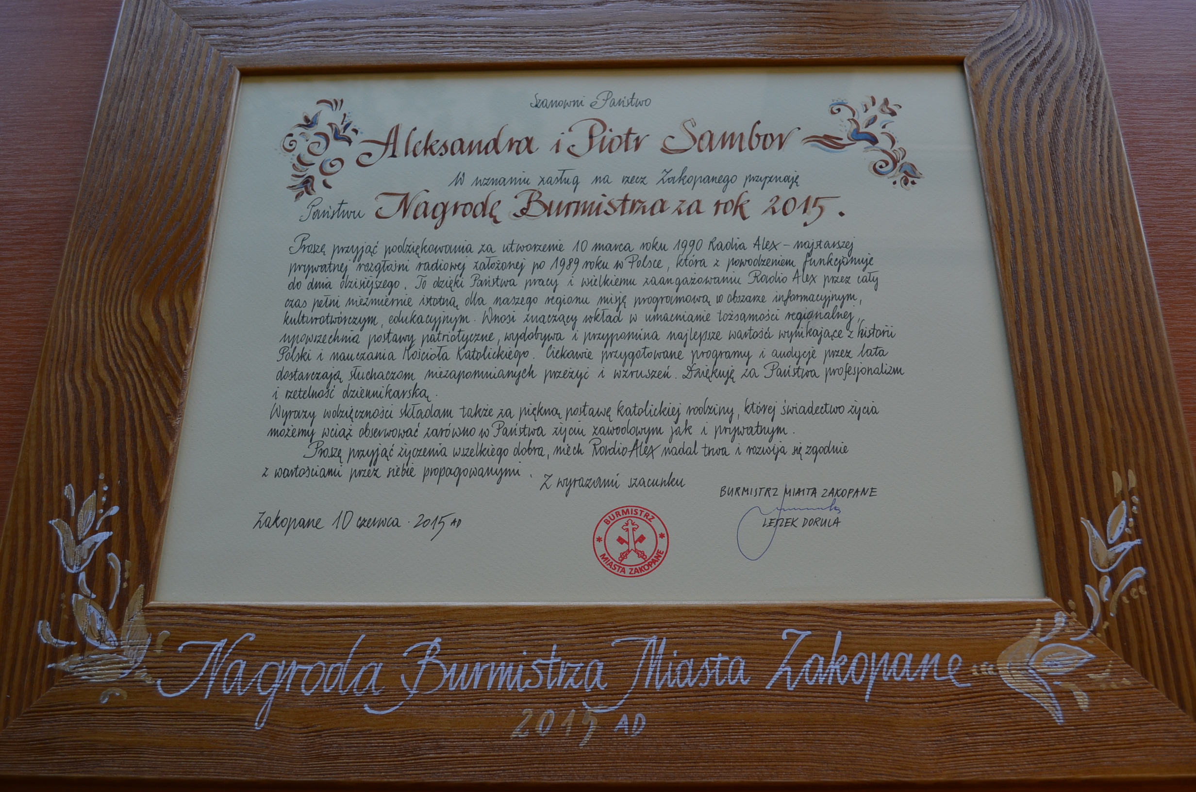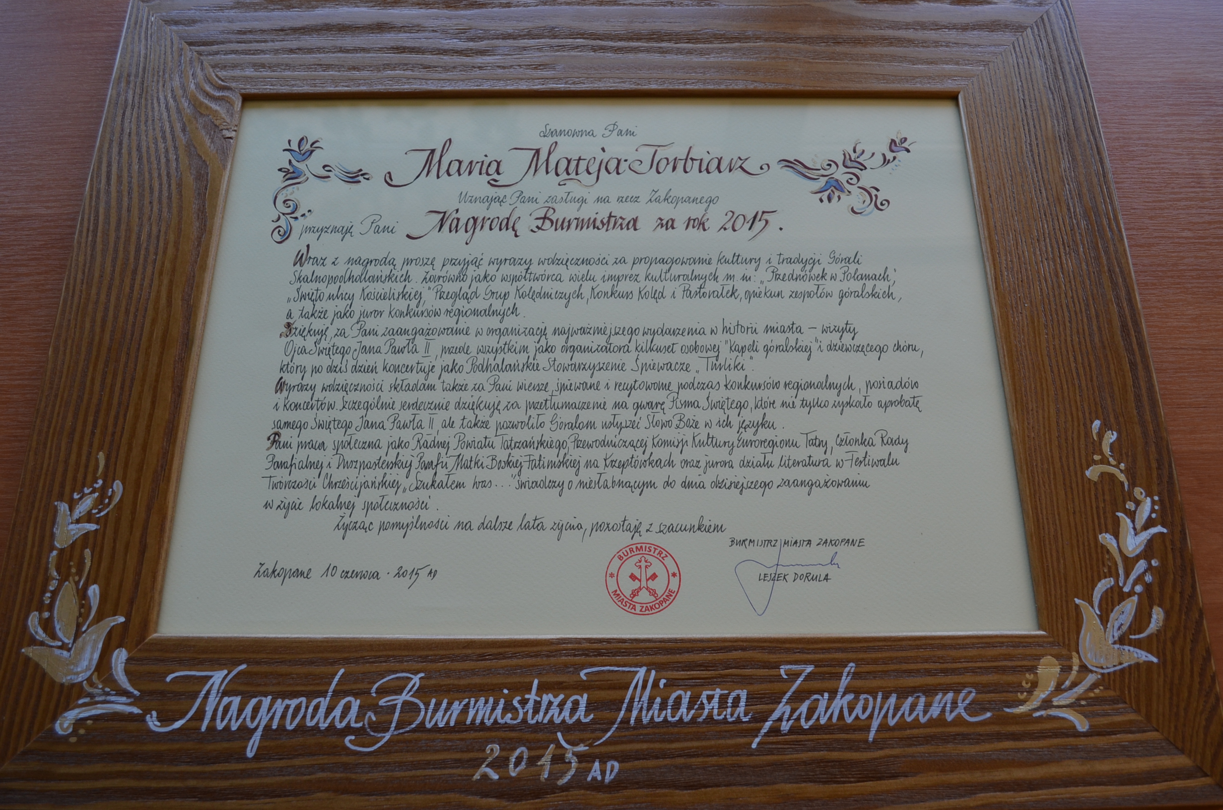 Podczas uroczystej sesji Rady Miasta Zakopane z okazji „25 lat Samorządności” Nagrody Burmistrza za rok 2015 r. otrzymali: Maria Mateja Torbiarz, Tadeusz Jankowski oraz Aleksandra i Piotr Samborowie. - Chcę pogratulować, ale przede wszystkim podziękować, bo to właśnie dzięki takim ludziom jak Państwo, Zakopane jest na ustach wszystkich, a my zakopiańczycy możemy czuć się dumnymi. Mam nadzieję, że nadal będziemy współpracować i działać na rzecz Zakopanego, naszego ukochanego miasta – powiedział burmistrz Leszek Dorula.
