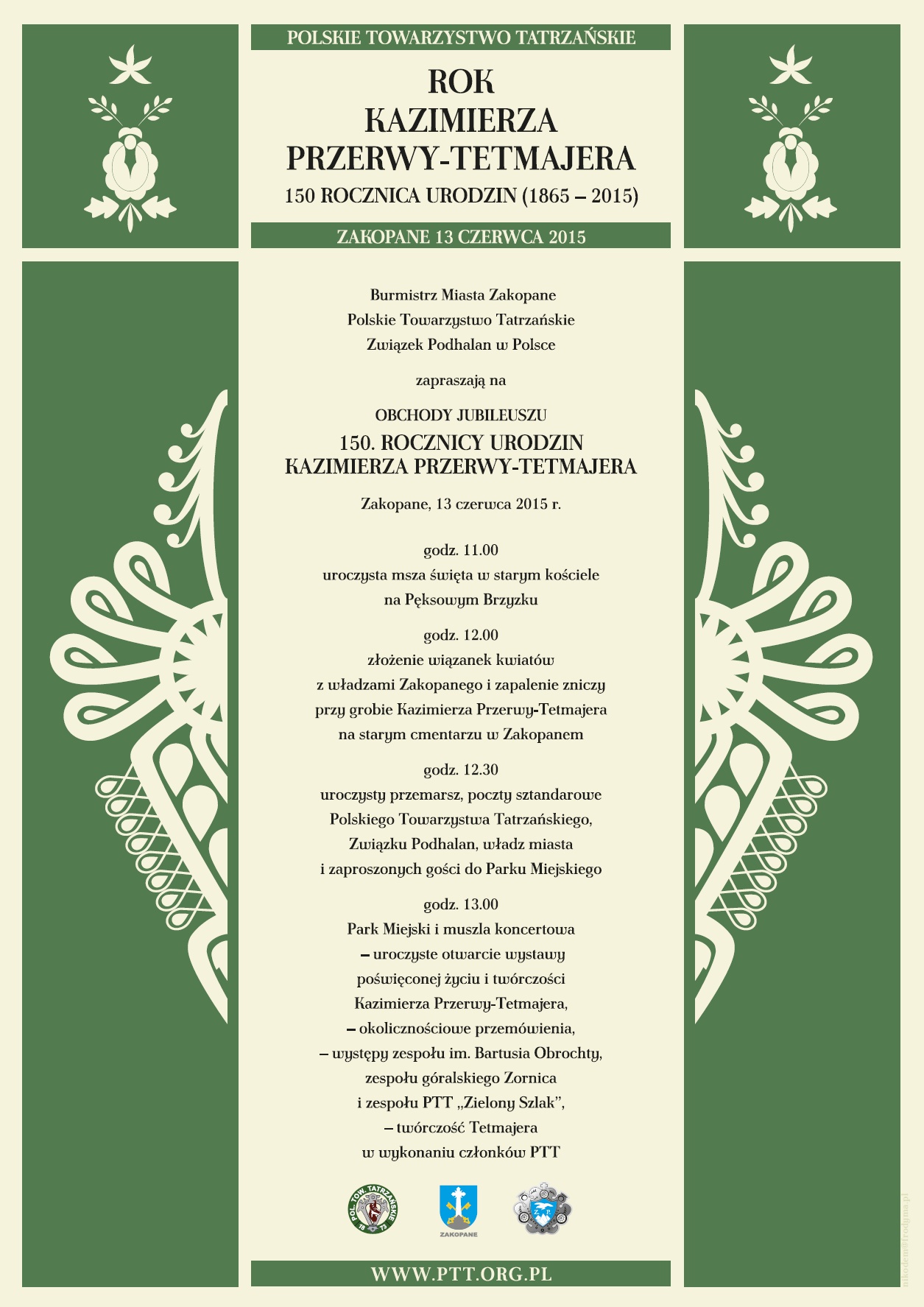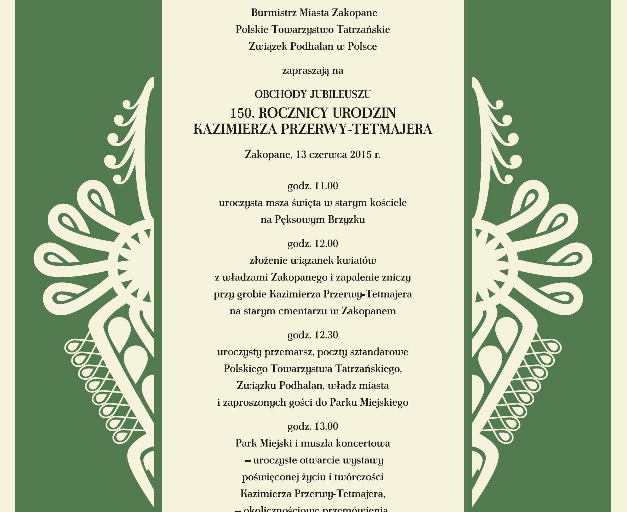 13 czerwca o godz. 11.00 w Zakopanem rozpoczną się uroczyste obchody Jubileuszu 150. Rocznicy Urodzin Kazimierza Przerwy-Tetmajera.