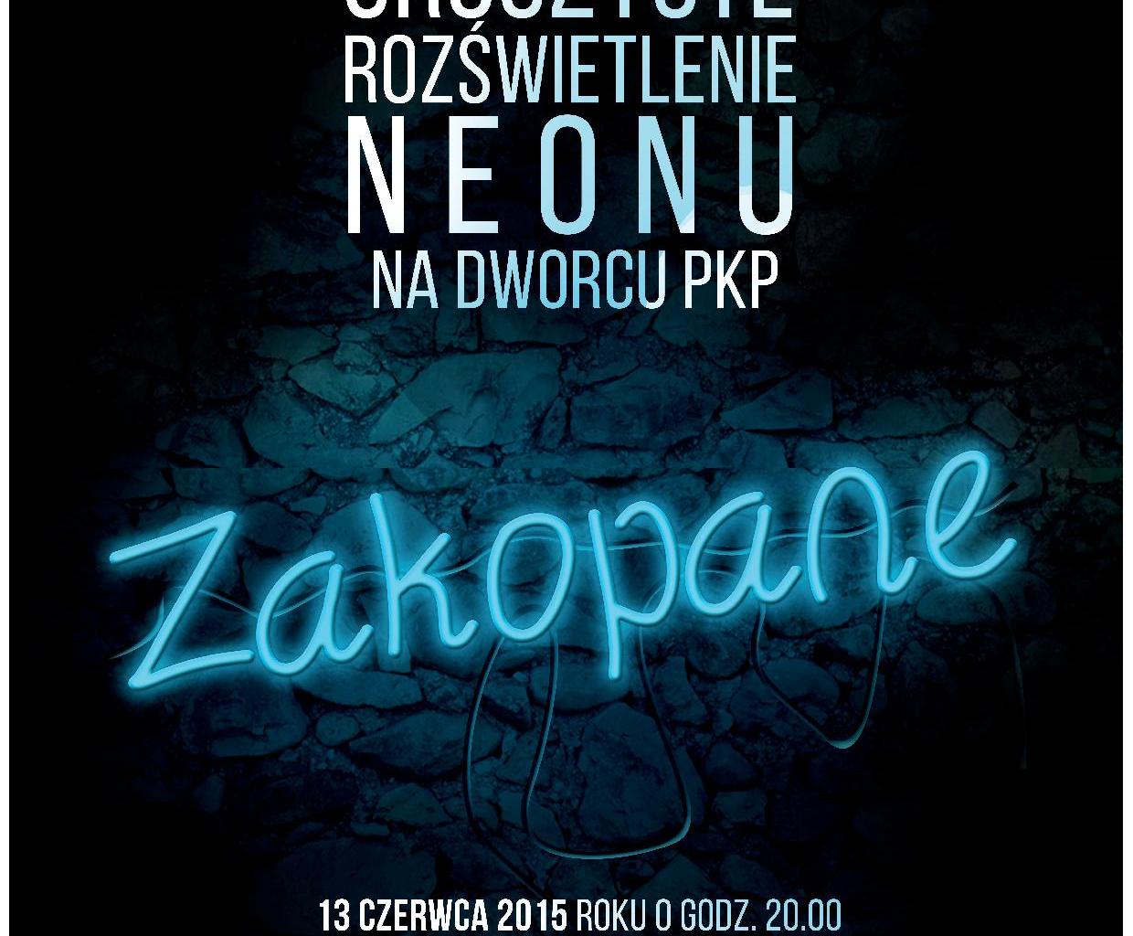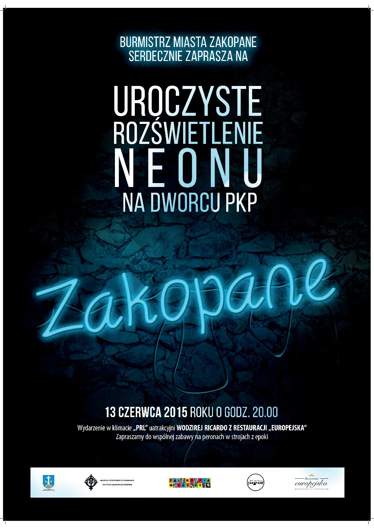 Burmistrz Miasta Zakopane Leszek Dorula zaprasza na uroczyste rozświetlenie neonu na Dworcu PKP 13 czerwca o godz. 20.00. Wydarzenie w klimacie PRL uatrakcyjni wodzirej Ricardo, poczęstunek z Kawiarni "Europejska", lemoniada z saturatora, wata cukrowa, prezentacja archiwalnych zdjęć Dworca PKP.
