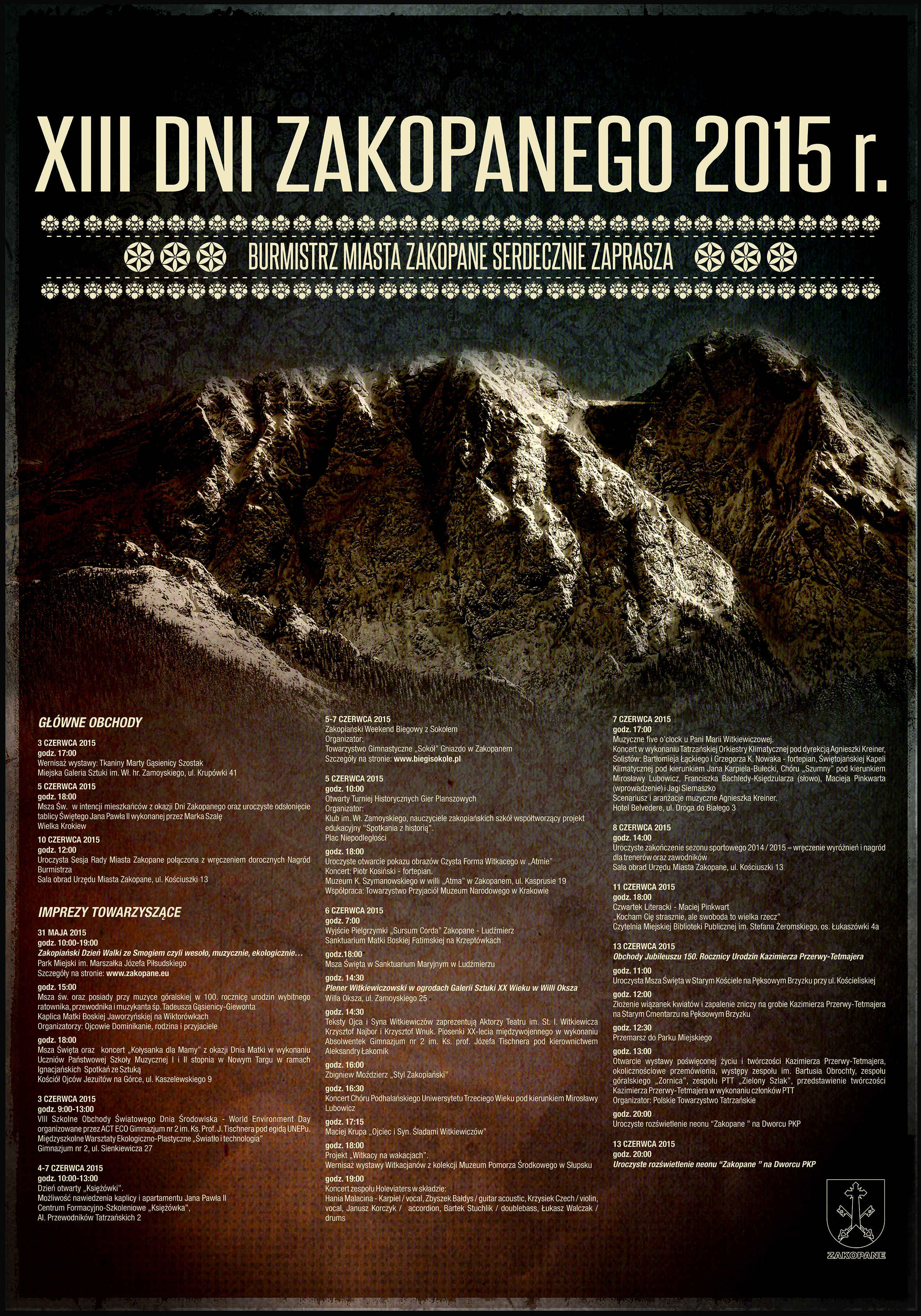 Burmistrz Miasta Zakopane Leszek Dorula w dniach 31 maja – 13 czerwca zaprasza na cykl imprez z okazji Dni Zakopanego. Są one organizowane co roku dla upamiętnienia wizyty Ojca Świętego Jana Pawła II w 1997 r. pod Giewontem. Tym razem w niezwykle bogatym programie znalazły się liczne wystawy, koncerty i spektakle, wydarzenia sportowe, a także Uroczysta Sesja Rady Miasta Zakopane, podczas której wręczane są doroczne Nagrody Burmistrza Miasta Zakopane.