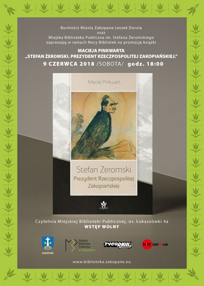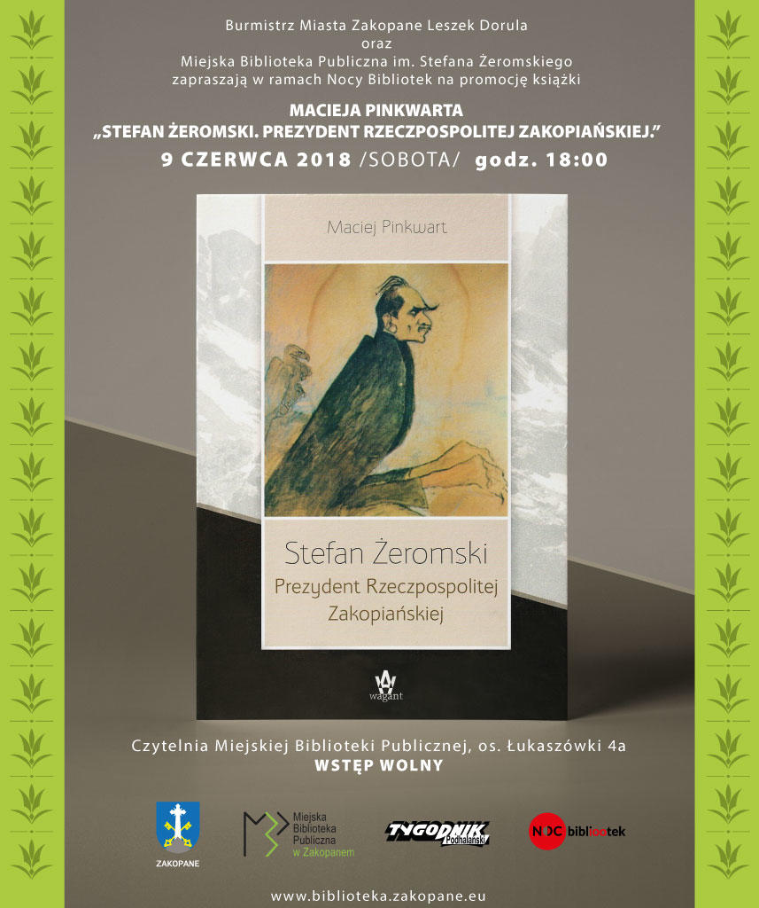 Z tej okazji Burmistrz Miasta Zakopane Leszek Dorula oraz Miejska Biblioteka Publiczna w Zakopanem zapraszają na spotkanie z Maciejem Pinkwartem, autorem książki „Stefan Żeromski. Prezydent Rzeczpospolitej Zakopiańskiej”, która właśnie ukazała się nakładem Wydawnictwa Wagant. Spotkanie odbędzie się w czytelni Miejskiej Biblioteki Publicznej, os. Łukaszówki 4a, godz. 18.00.