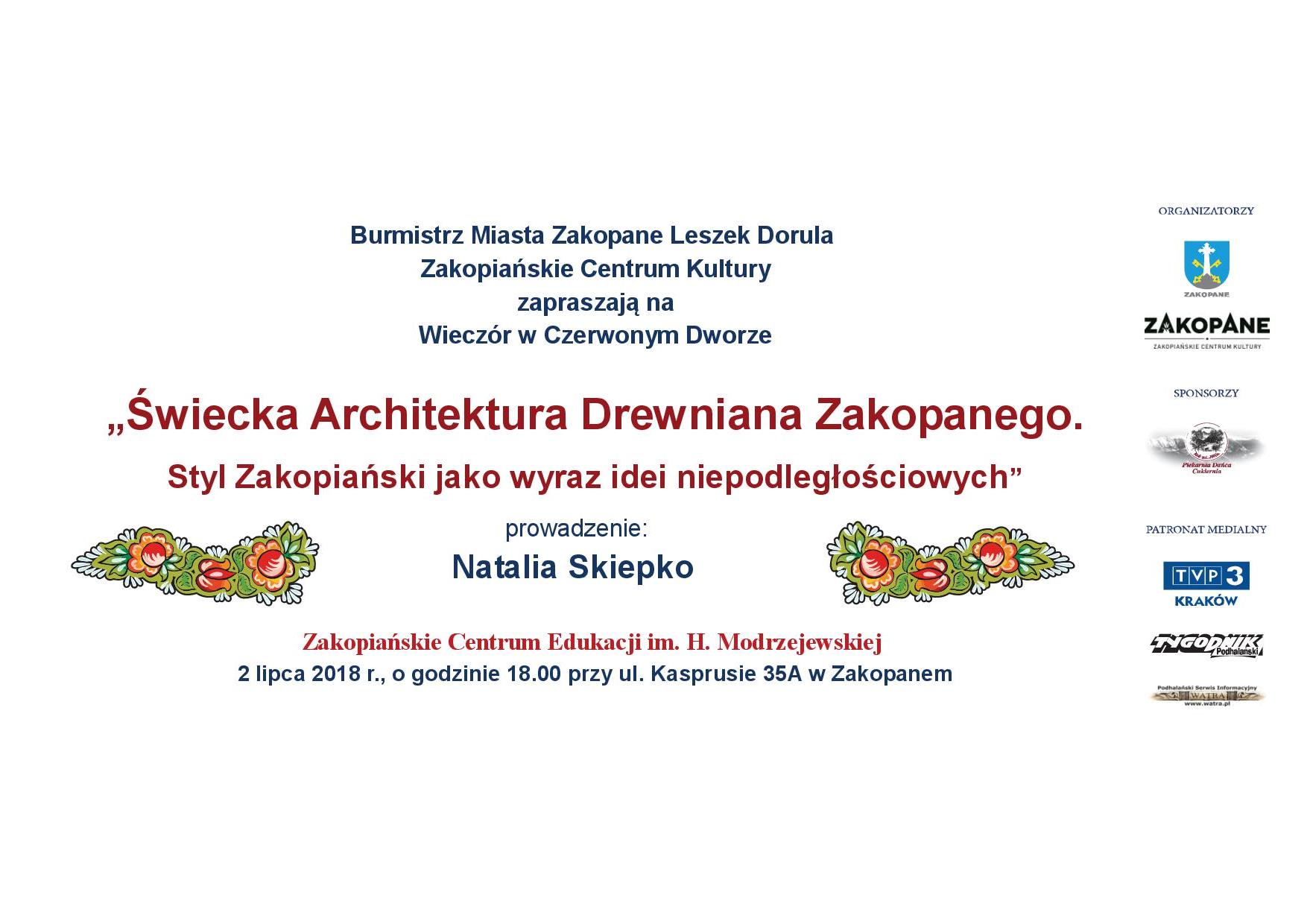 Burmistrz Miasta Zakopane Leszek Dorula i Zakopiańskie Centrum Kultury zapraszają na Wieczór w Czerwonym Dworze „Świecka architektura drewniana Zakopanego. Styl Zakopiański jako wyraz idei niepodległościowych” 2 lipca o godz. 18.00, ZCE, ul. Kasprusie 35A.