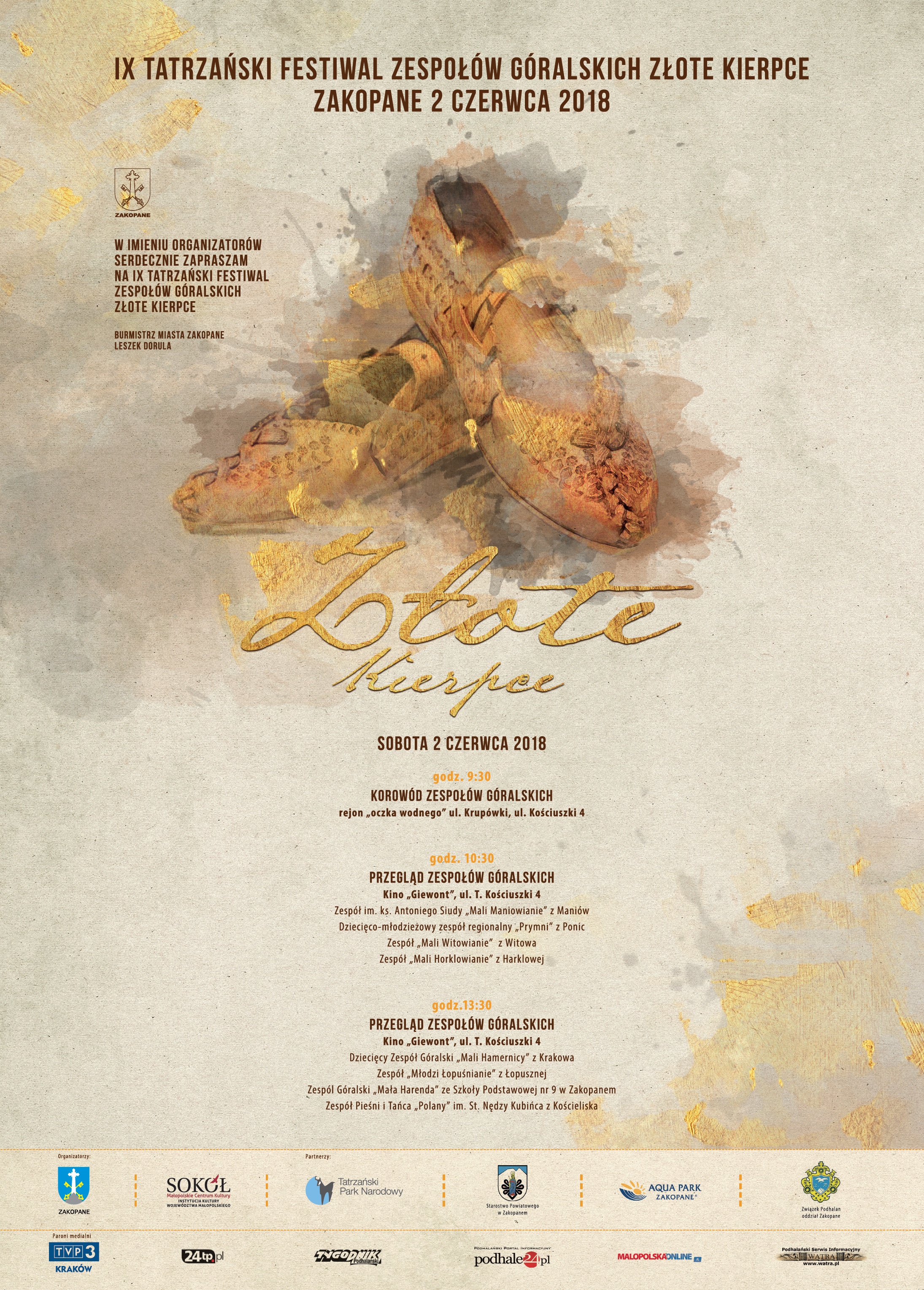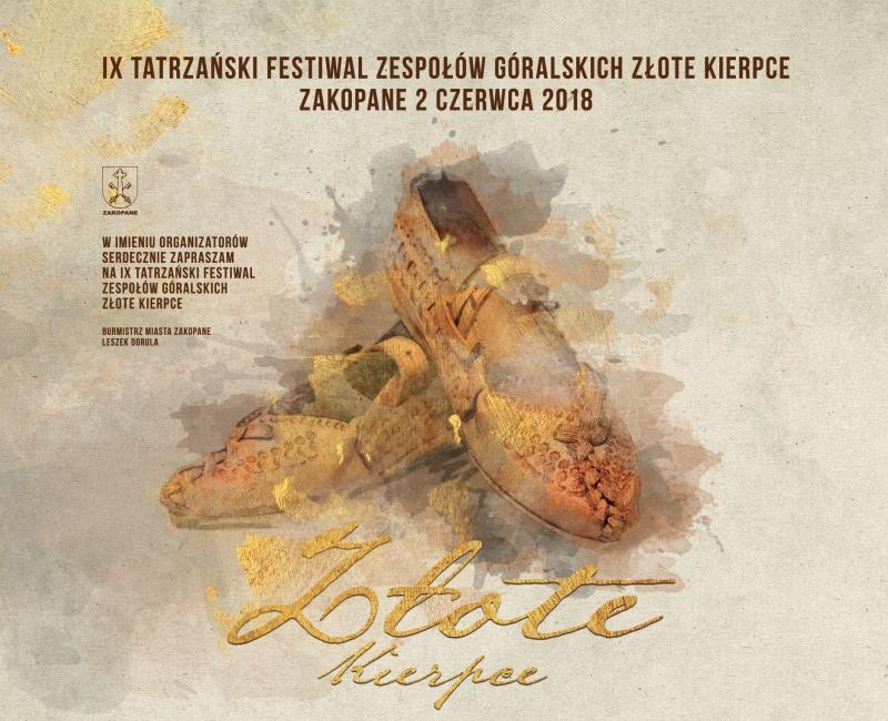 Burmistrz Miasta Zakopane Leszek Dorula w imieniu organizatorów zaprasza na IX Tatrzański Festiwal Zespołów Góralskich ZŁOTE KIERPCE, który odbędzie się w dniu 2 czerwca 2018.