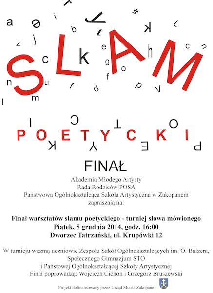 Szkoła Artystyczna zaprasza na finał warsztatów slamu poetyckiego, który odbędzie się w piątek, 5 grudnia o godz. 16.00 w Dworcu Tatrzańskim przy ul. Krupówki 12. Wezmą w nim udział gimnazjaliści z POSA oraz uczniowie z Zespołu Szkół Ogólnokształcących im. O. Balzera w Zakopanem i Społecznego Gimnazjum STO w Zakopanem.