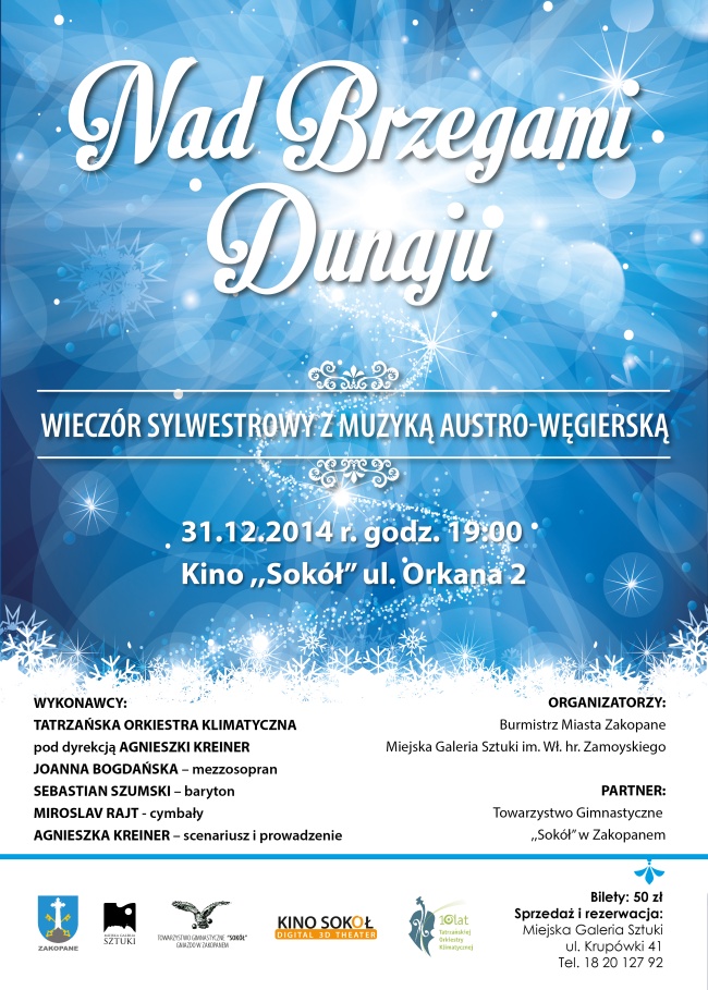 31 grudnia o godz.19.00 w Kinie „Sokół”, ul. Orkana 2 odbędzie się Wieczór Sylwestrowy „Nad brzegami Dunaju” w wykonaniu Tatrzańskiej Orkiestry Klimatycznej. Przedsprzedaż biletów od 15 grudnia będzie prowadzić Miejska Galeria Sztuki.