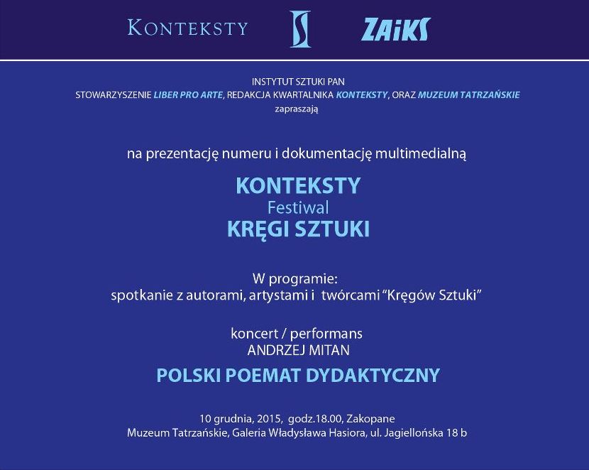 Instytut Sztuki PAN, Muzeum Tatrzańskie, Stowarzyszenie Liber Pro Arte oraz redakcja kwartalnika „KONTEKSTY” serdecznie zapraszają na prezentację numeru „KONTEKSTY Festiwal KRĘGI SZTUKI”, który jest dedykowany pięciu edycjom Festiwalu Europejskich Szkół Artystycznych i Twórczości „Kręgi Sztuki”.