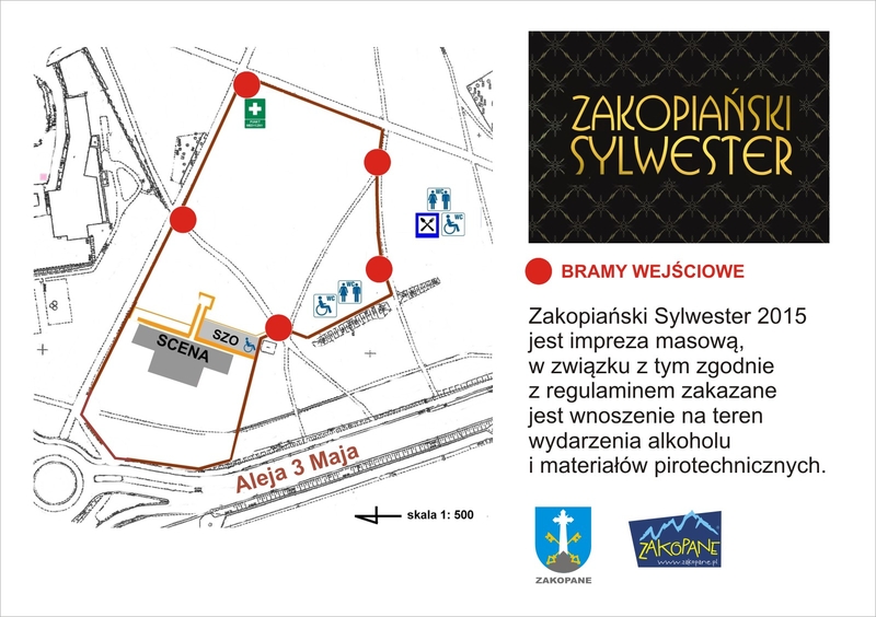 Burmistrz Miasta Zakopane informuje, w dniu 31 grudnia 2015 r. w godz. 20.00 – 01.00 na Dolnej Równi Krupowej zorganizowana zostanie impreza masowa „Zakopiański Sylwester 2015”. Jest to bardzo ważne wydarzenie, po raz pierwszy przygotowywane w tak dużej skali w naszym mieście. Organizatorzy zapewniają, że przedsięwzięli wszystkie środki w celu zapewnienia bezpieczeństwa wszystkim jego uczestnikom. Jednocześnie przepraszają mieszkańców budynków sąsiadujących z terenem imprezy za możliwe uciążliwości w tym terminie związane m.in. z utrudnieniami w ruchu samochodowym oraz emitowaną muzyką. Dziękując za wyrozumiałość Burmistrz jednocześnie zaprasza do udziału we wspólnym przywitaniu Nowego Roku.