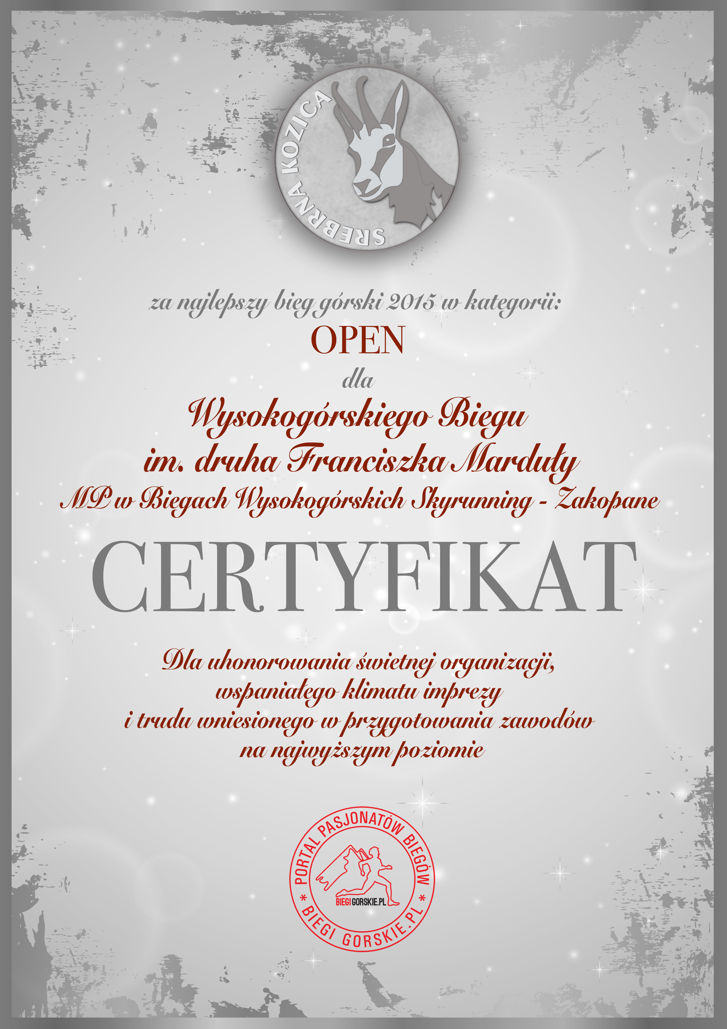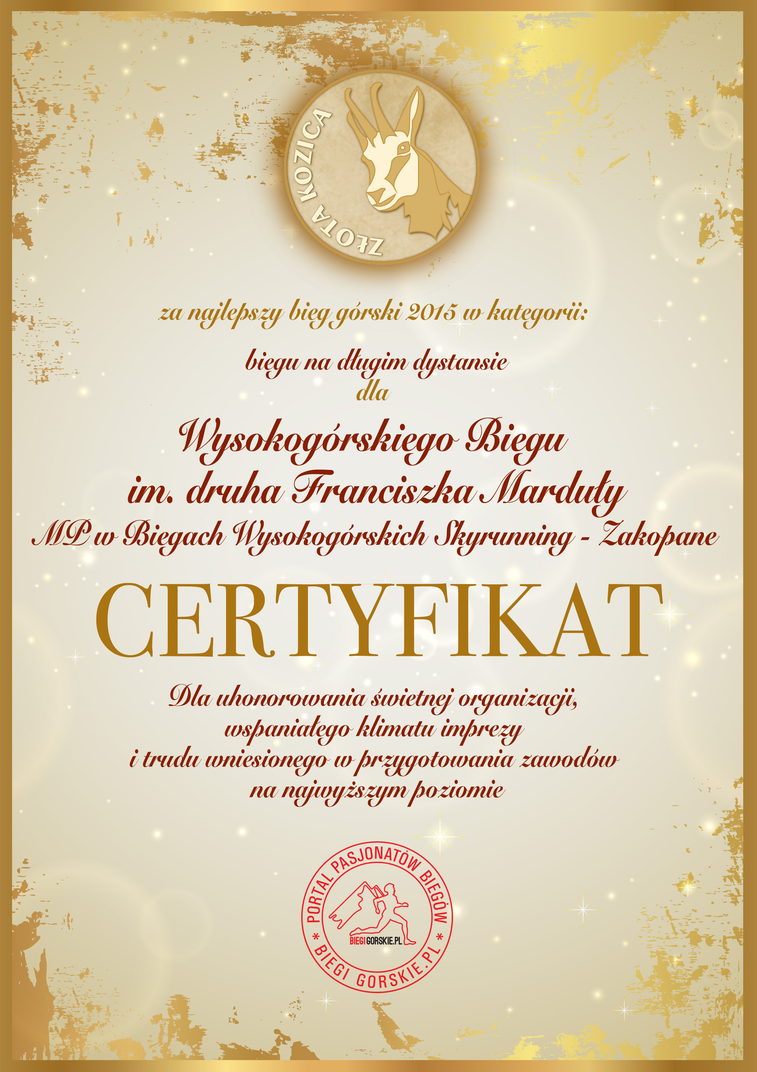 W rozstrzygniętym właśnie konkursie na Najlepsze Biegi Górskie sezonu 2015 organizowanym przez portal biegigorskie.pl Zakopiański Weekend Biegowy z Sokołem zdobył aż pięć nagród w rożnych kategoriach. Wysokogórski Bieg im. dha Franciszka Marduły zdobył Srebrną Kozice w kategorii open i Złotą Kozicę w kategorii Najlepszy bieg górski na długim dystansie, Srebrne Kozice w swoich kategoriach zdobyły też dwa pozostałe biegi rozgrywane w ramach Weekendu - Bieg im. hr. Władysława Zamoyskiego (w kategorii Najlepszy bieg górski w stylu alpejskim) oraz Bieg Sokoła (w kategorii Najlepszy bieg górski w stylu anglosaskim). Z kolei cała impreza zdobyła Srebrną Kozicę w kategorii najlepszy festiwal biegowy. Zawody organizuje Towarzystwo Gimnastyczne „Sokół” Gniazdo w Zakopanem.