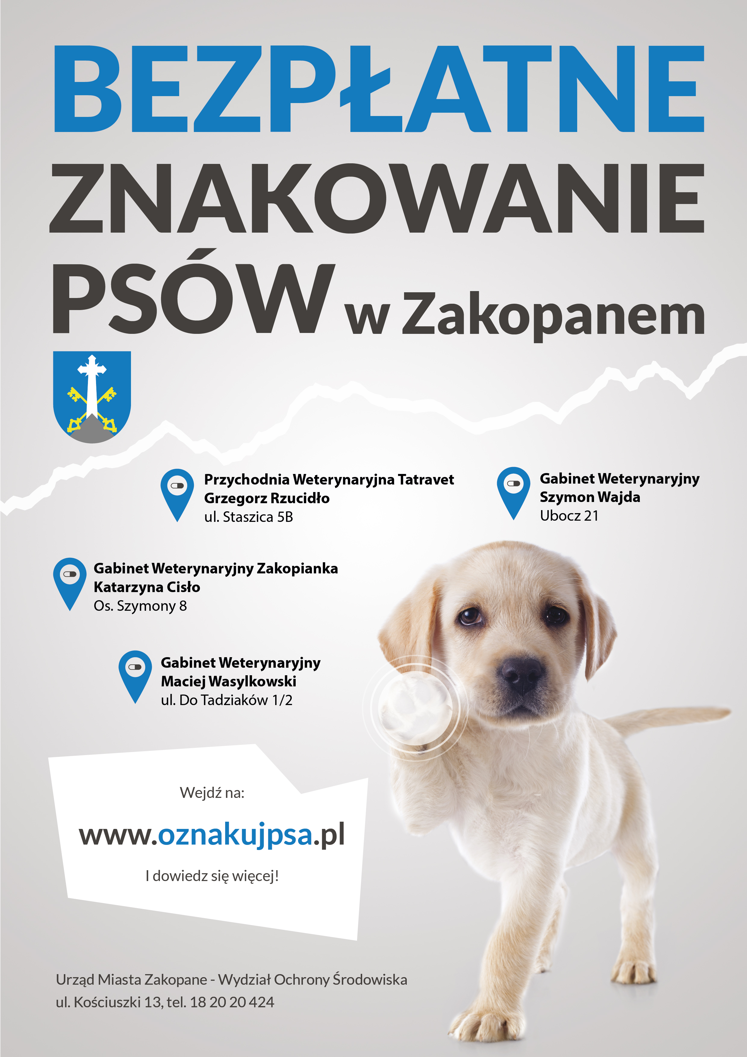 Psy z terenu Gminy Miasto Zakopane można bezpłatnie oznakować w kilku przychodniach weterynaryjnych tj.: