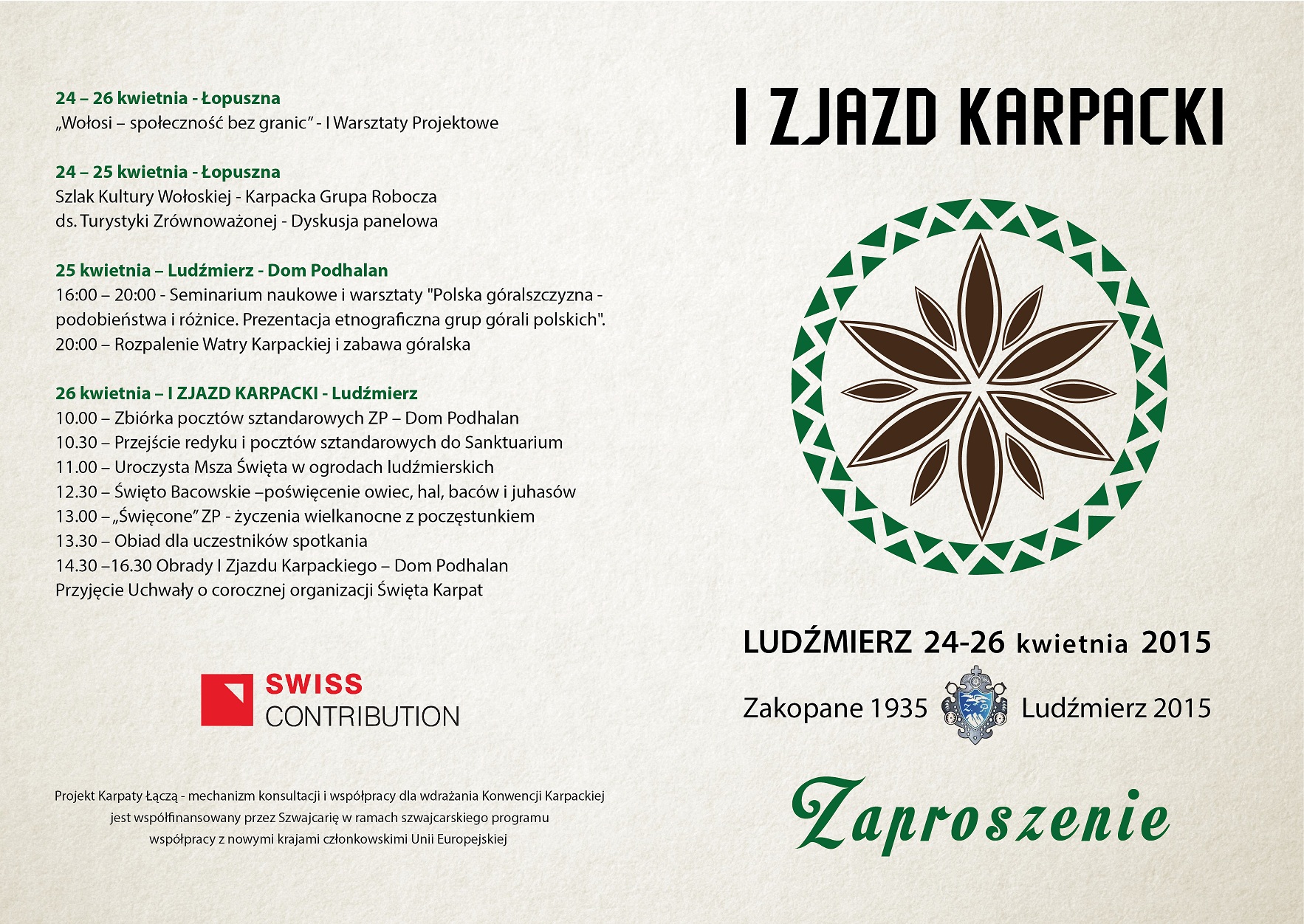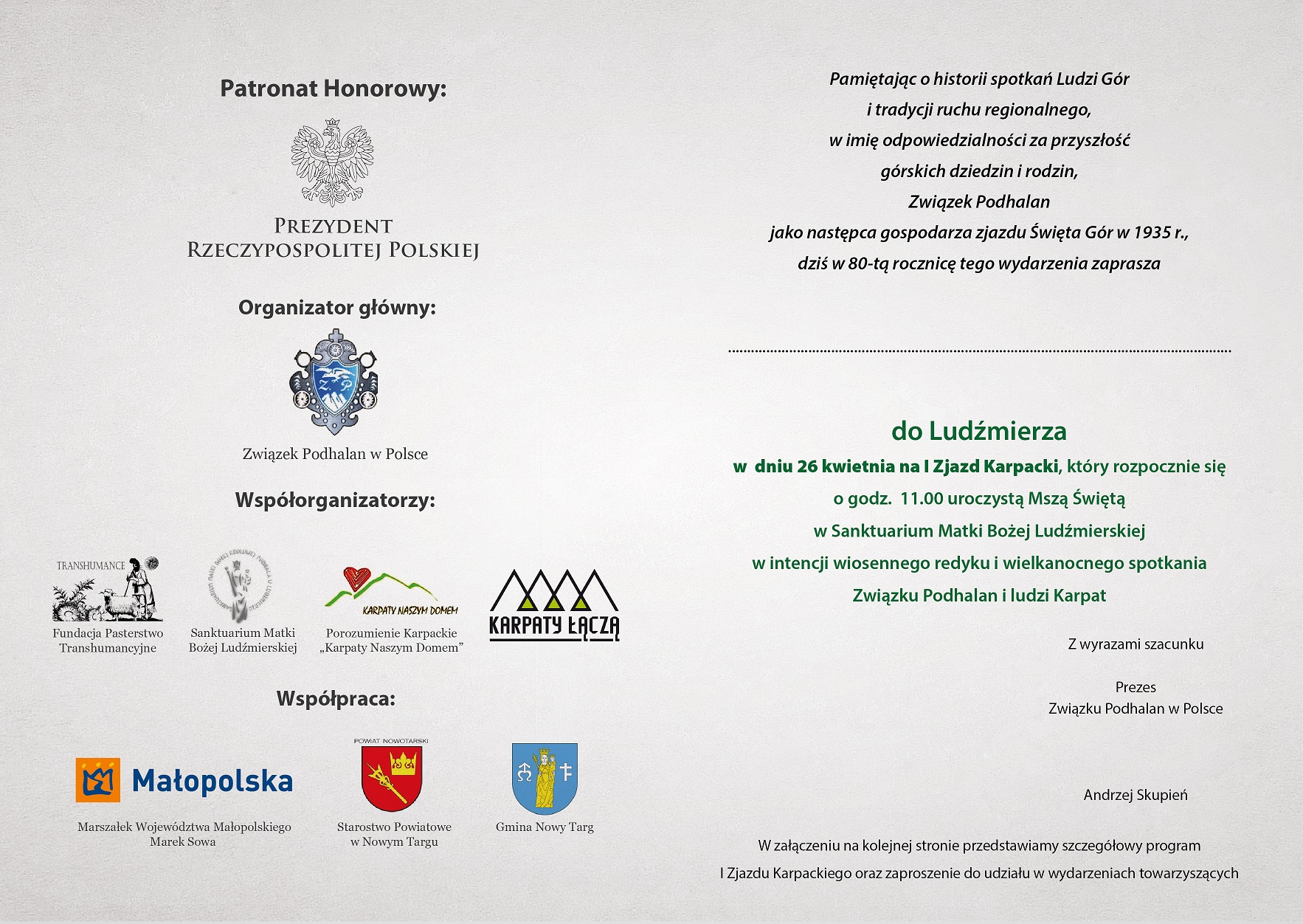 Zapraszamy wszystkich miłośników gór na I ZJAZD KARPACKI zorganizowany pod patronatem Prezydenta Rzeczypospolitej Polskiej przez jedną z najstarszych organizacji społeczno–kulturalnych działających na terenie Karpat – Związek Podhalan – przy wsparciu i współdziałaniu innych stowarzyszeń i organizacji działających na terenach górskich.