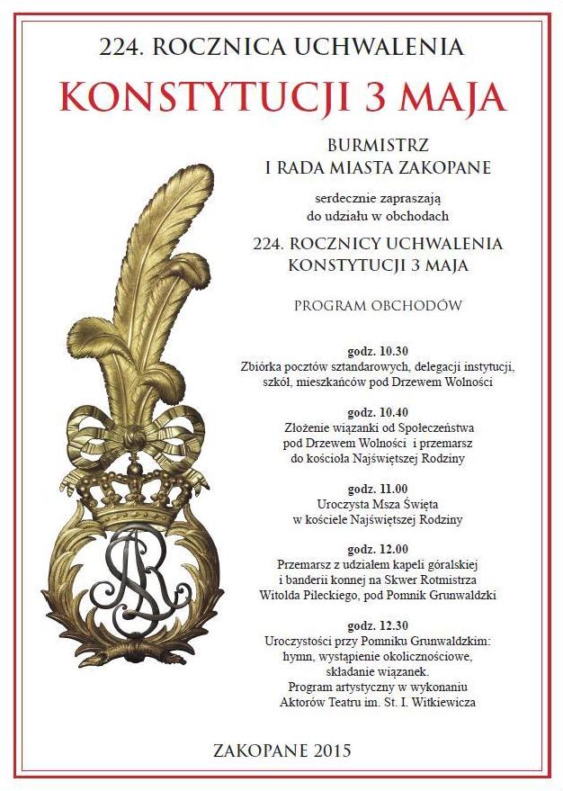 BURMISTRZ LESZEK DORULA I RADA MIASTA ZAKOPANE serdecznie zapraszają do udziału w obchodach 224. ROCZNICY UCHWALENIA KONSTYTUCJI 3 MAJA