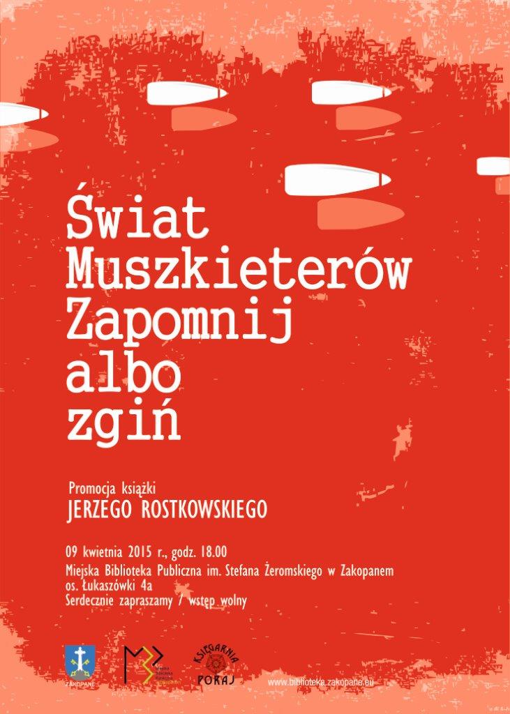Miejska Biblioteka Publiczna im. Stefana Żeromskiego w Zakopanem zaprasza 9 kwietnia br. o godz. 18.00 na „Czwartek Literacki” z udziałem Jerzego Rostkowskiego, autora książki pt. „Świat Muszkieterów. Zapomnij albo zgiń”. Czytelnia MBP, os. Łukaszówki 4a. Wstęp wolny. Serdecznie zapraszamy.