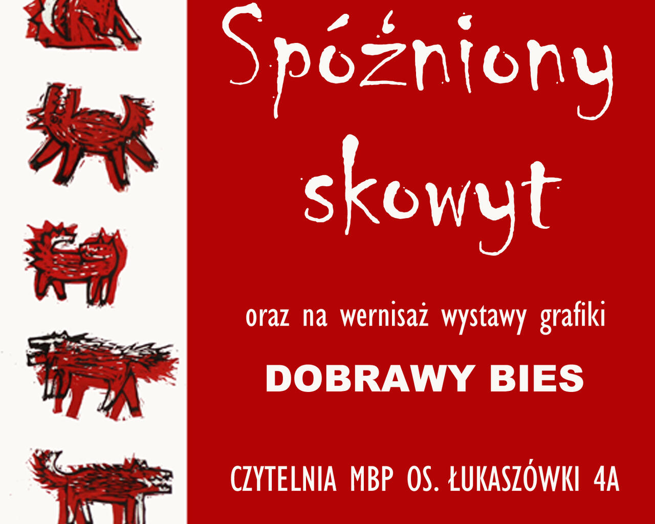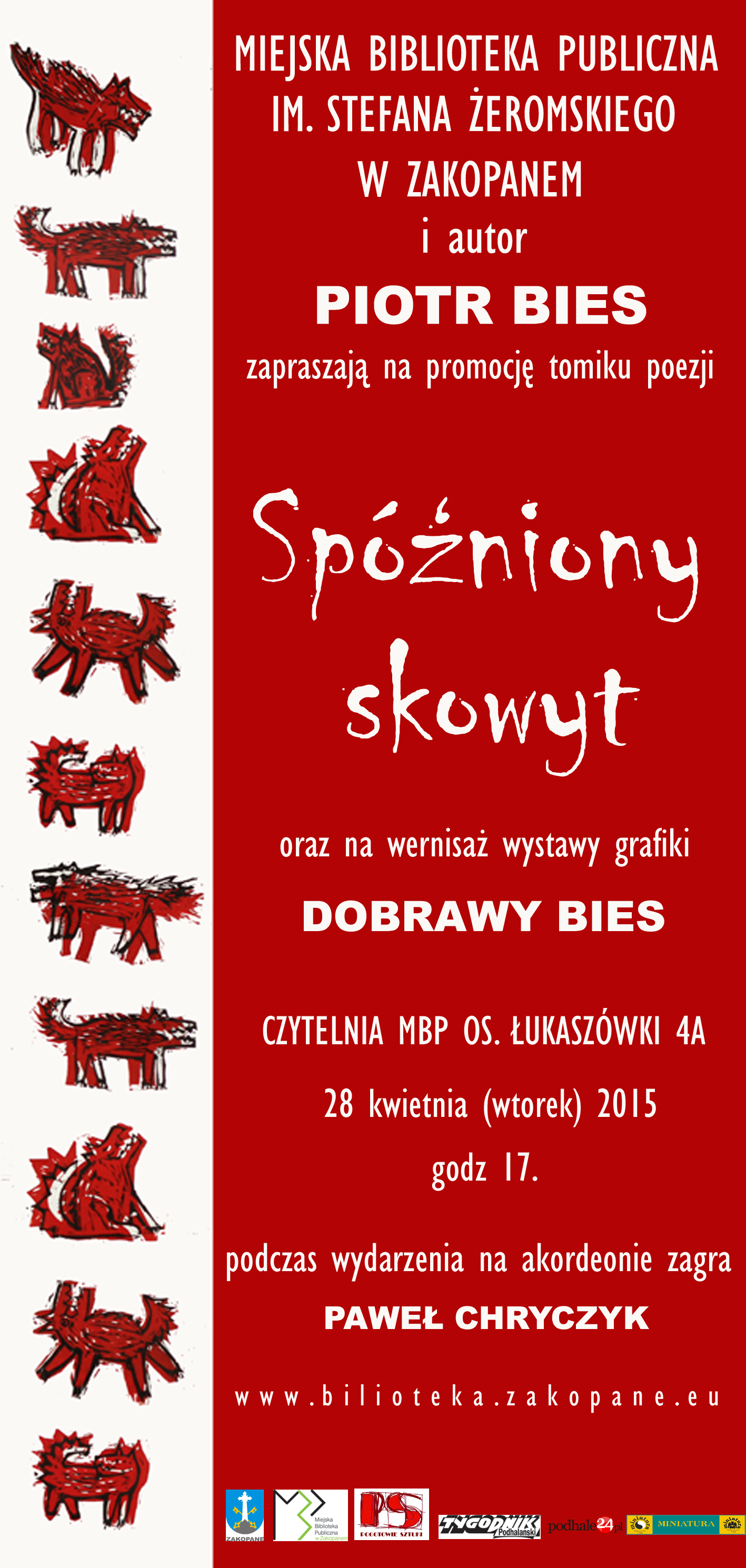 Miejska Biblioteka Publiczna im. Stefana Żeromskiego w Zakopanem zaprasza 28 kwietnia (wtorek) 2015 r. o godz. 17.00, na promocję tomiku poezji Piotra Biesa pt. „Spóźniony skowyt” oraz wernisaż wystawy grafiki Dobrawy Bies.