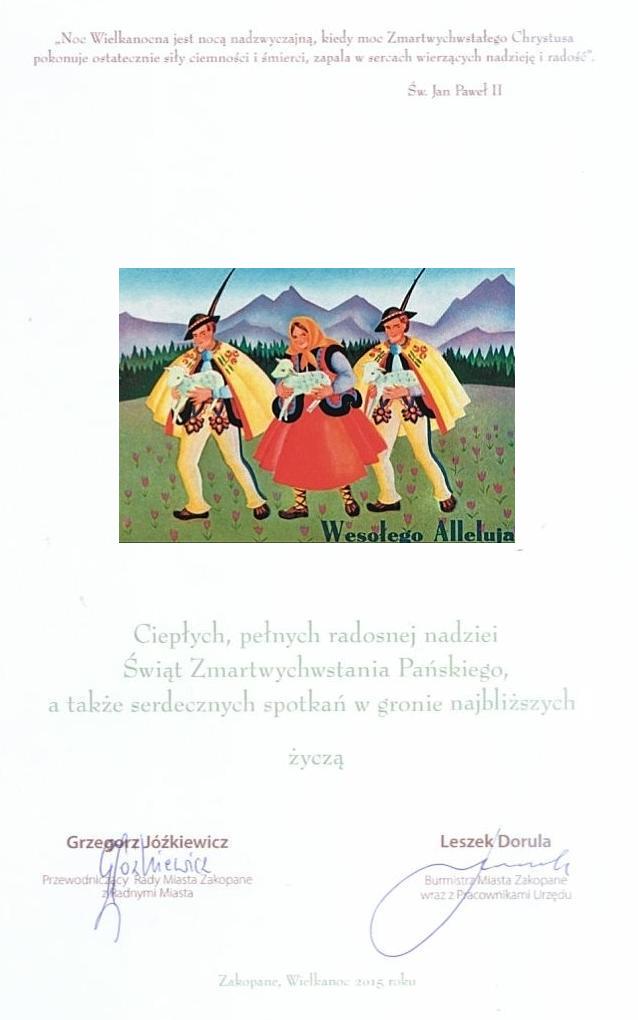 Ciepłych, pełnych radosnej nadziei Świąt Zmartwychwstania Pańskiego, a także serdecznych spotkań w gronie najbliższych życzą Burmistrz Miasta Zakopane Leszek Dorula i Przewodniczący Rady Miasta Zakopane Grzegorz Jóźkiewicz.
