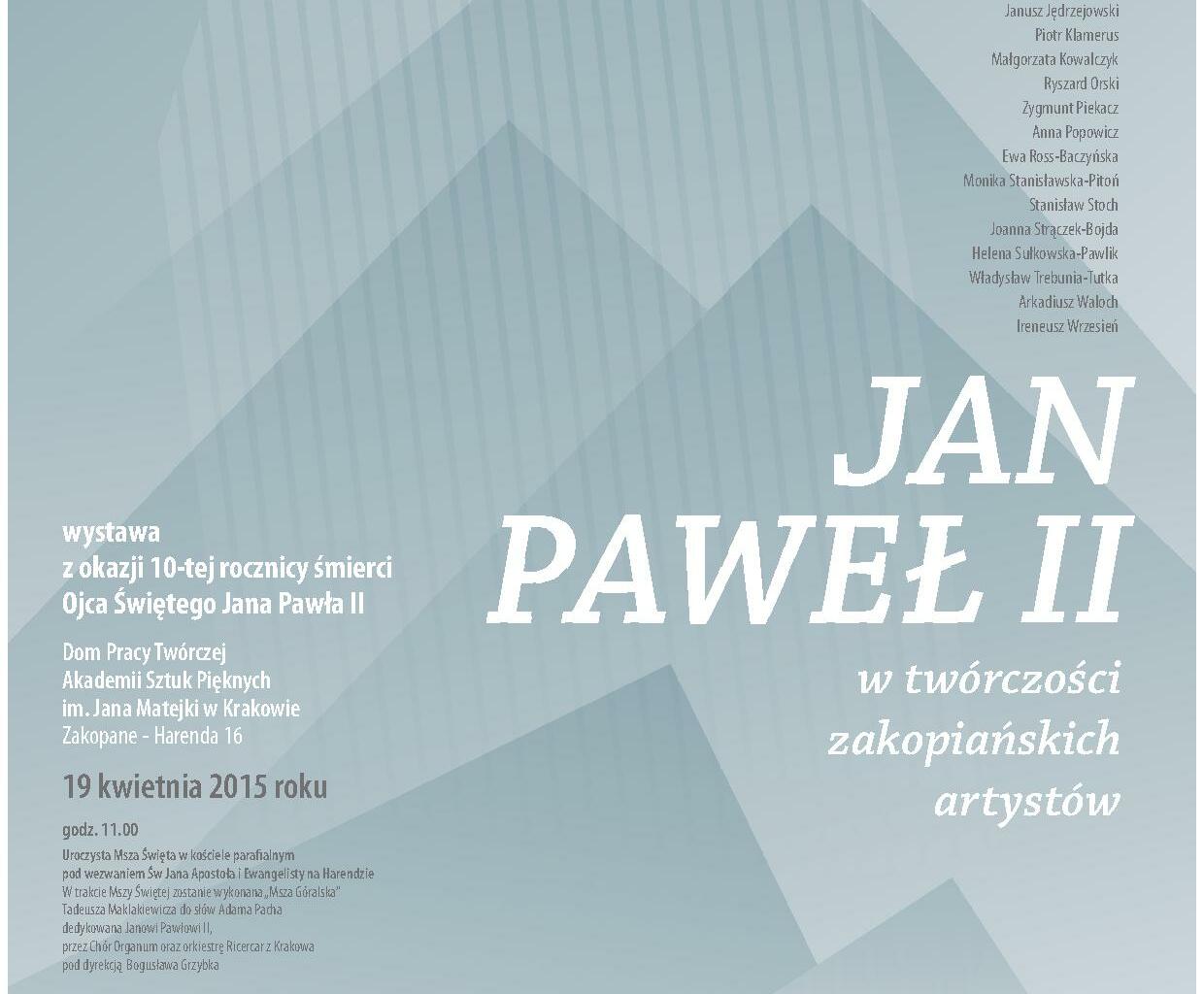Akademia Sztuk Pięknych w Krakowie przy współpracy z Urzędem Miasta Zakopane w związku z przypadającą 10. rocznicą śmierci Ojca Świętego Jana Pawła II organizuje w Domu Pracy Twórczej Akademii Sztuk Pięknych na Harendzie w Zakopanem wystawę „Jan Paweł II w twórczości Zakopiańskich Artystów”.