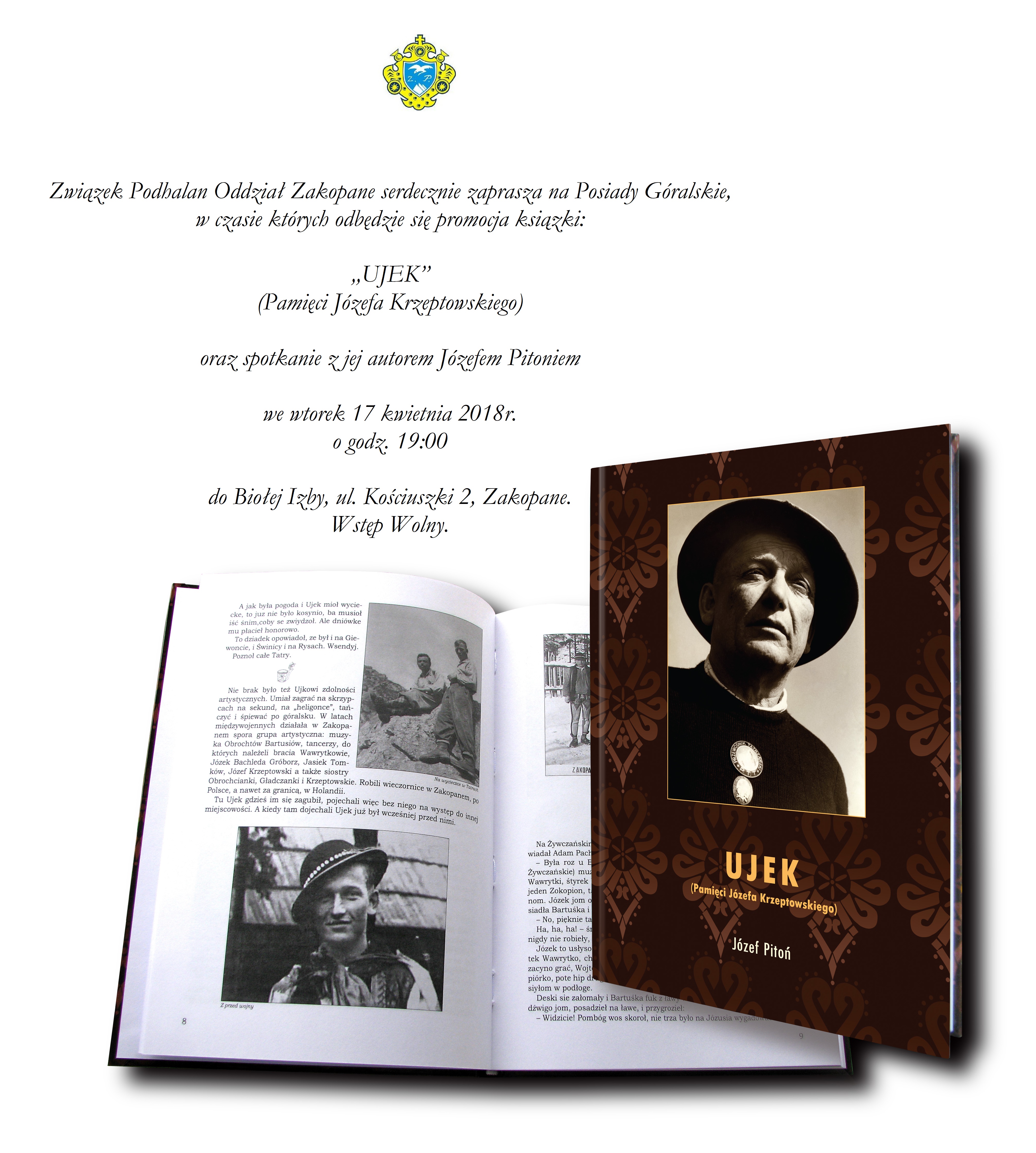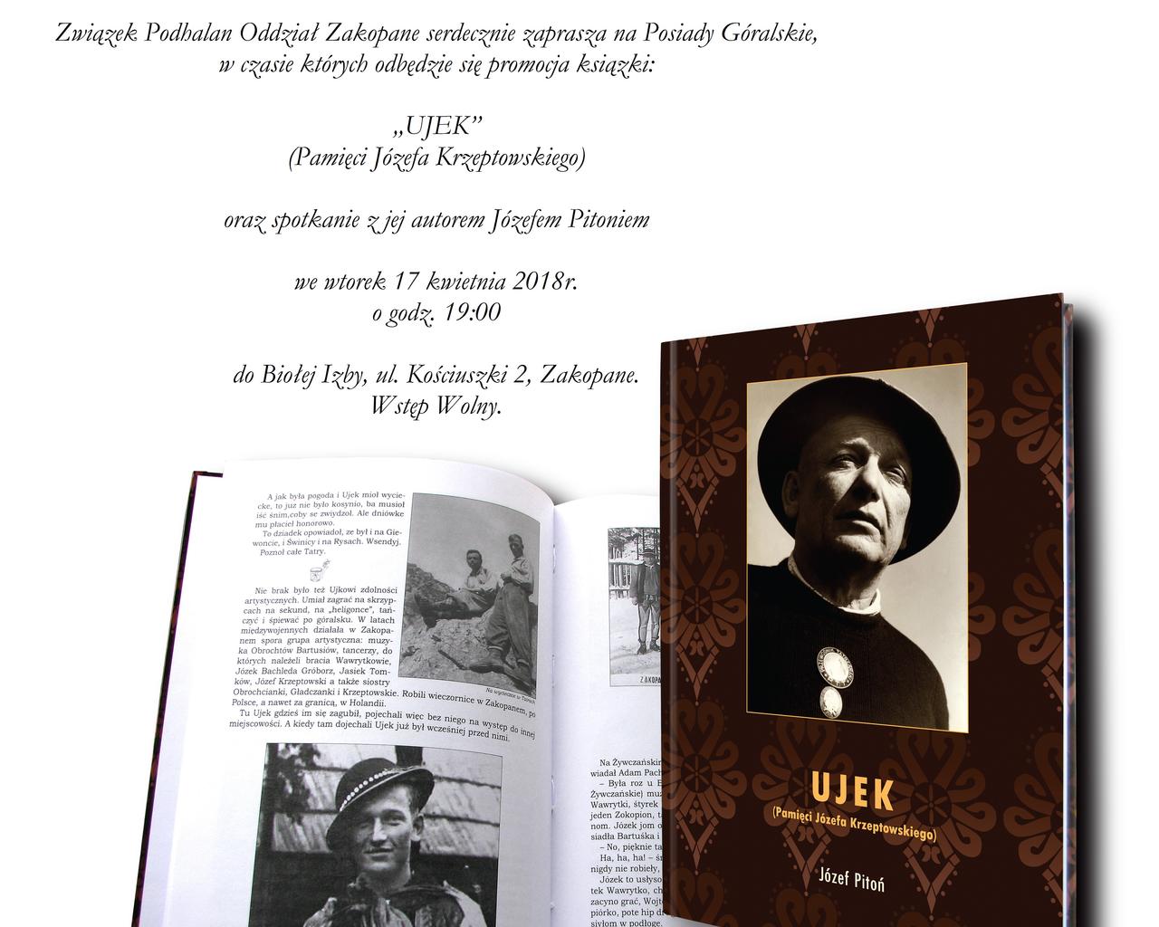 Związek Podhalan oddział Zakopane we wtorek 17 kwietnia 2018 r. o godz. 19:00 zaprasza na Posiady Góralskie, w czasie których odbędzie się promocja książki "UJEK" (pamięci Józefa Krzeptowskiego ) oraz spotkanie z  jej autorem Józefem Pitoniem.