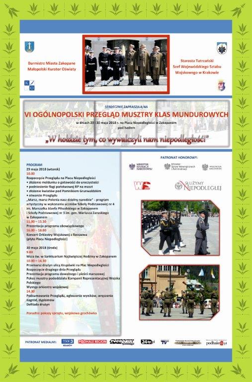 Małopolski Kurator Oświaty, Szef Wojewódzkiego Sztabu Wojskowego w Krakowie, Starosta Tatrzański, Burmistrz Miasta Zakopane zapraszają na VI Ogólnopolski Przegląd Musztry Klas Mundurowych, który odbędzie w dniach 29 i 30 maja 2018 na płycie Placu Niepodległości w Zakopanem.