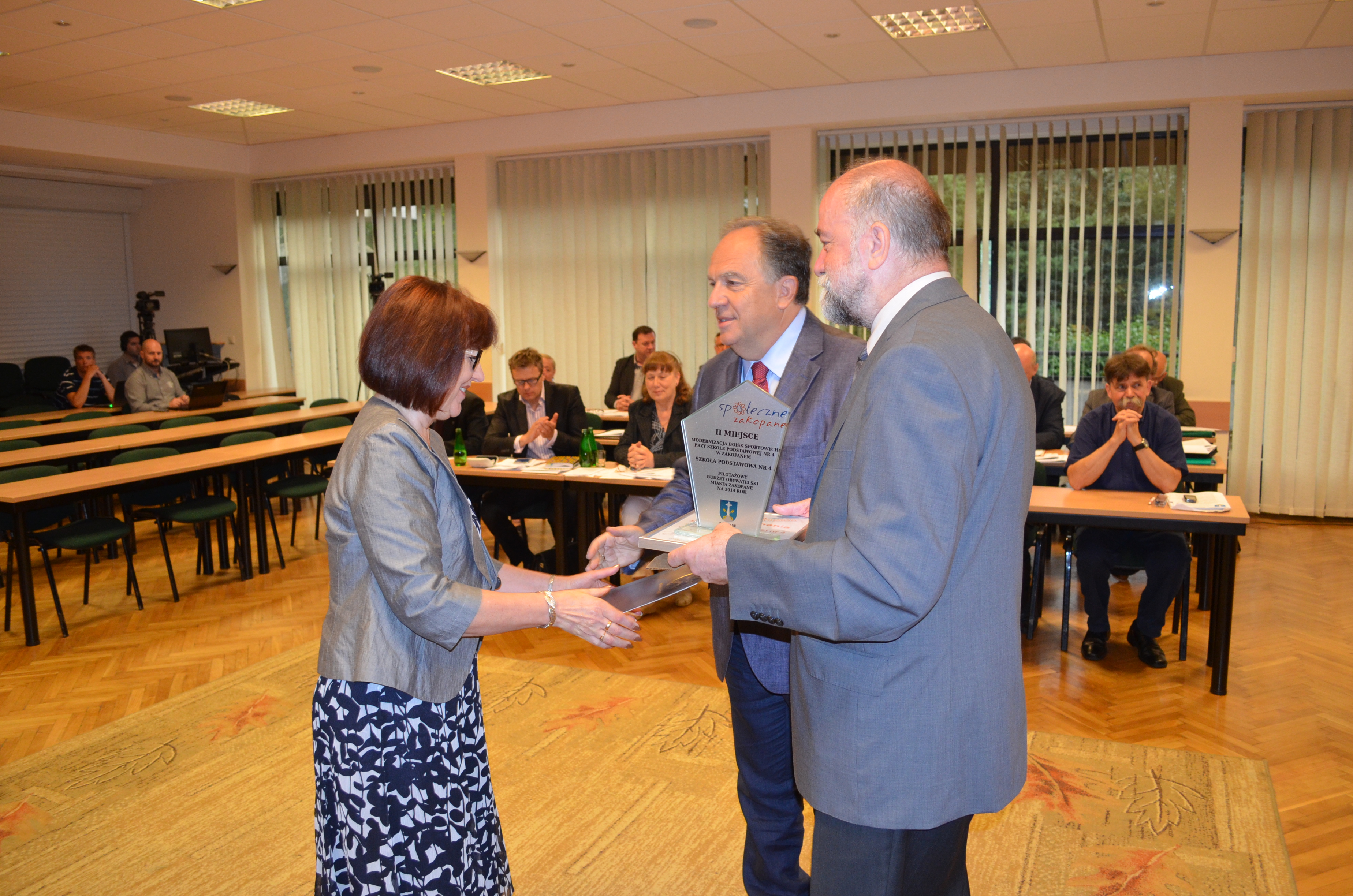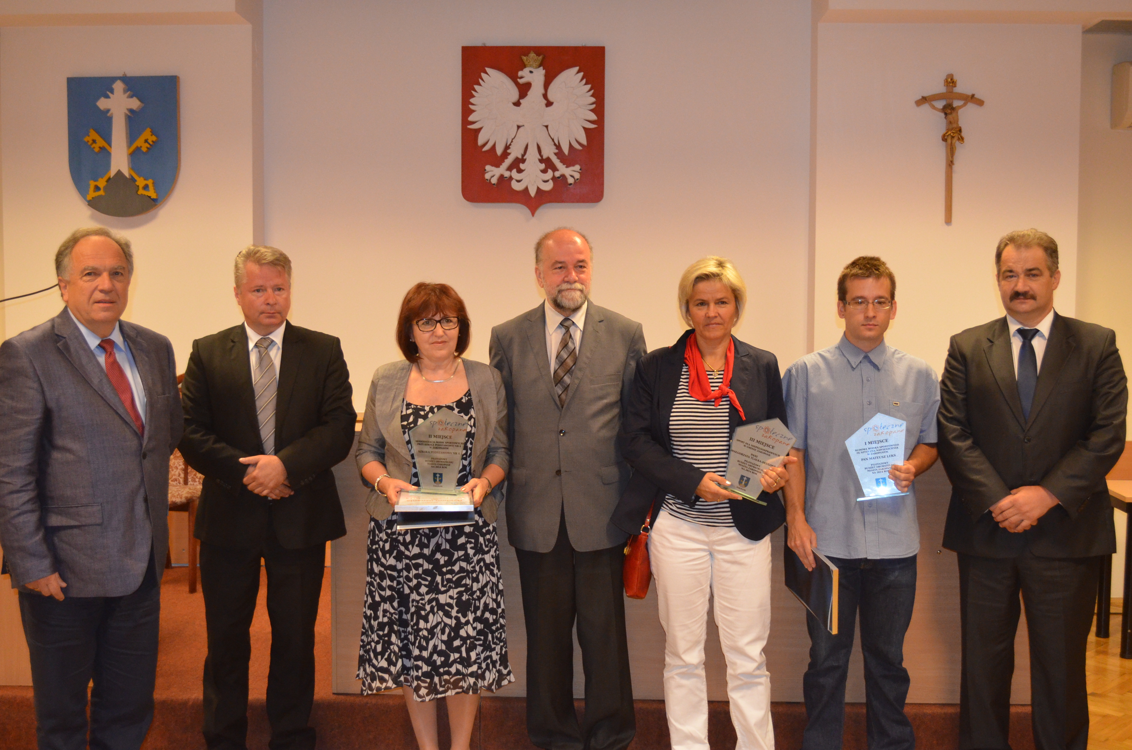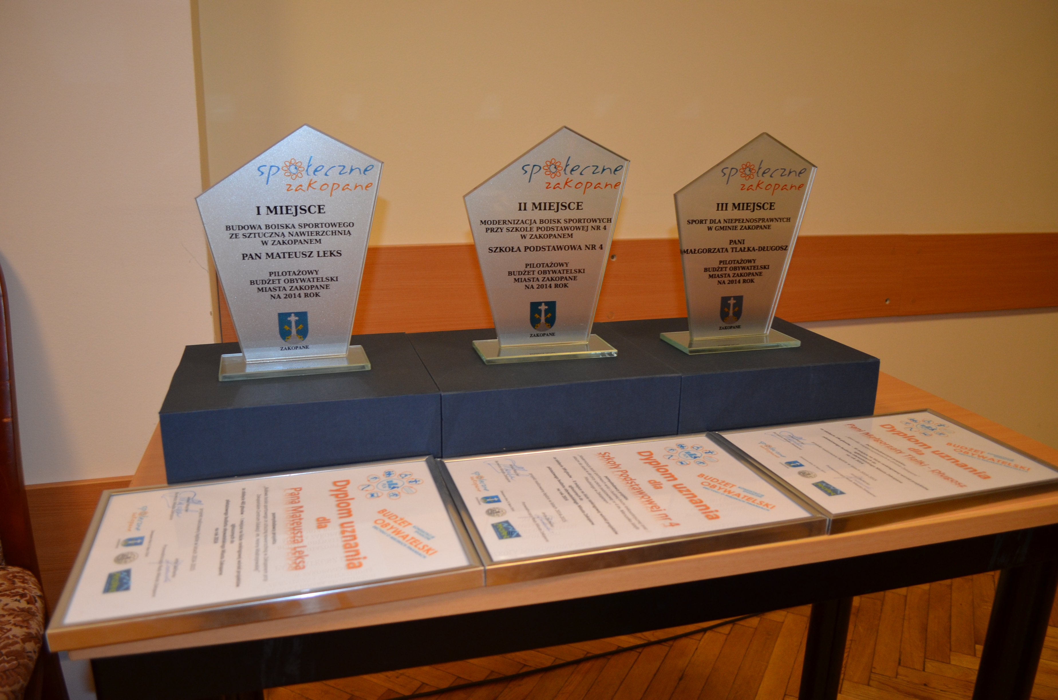Podczas LVI sesji Rady Miasta Zakopane pomysłodawcy trzech projektów, które uzyskały w Pilotażowym Budżecie Obywatelskim Miasta Zakopane na 2014 r. najwięcej głosów, otrzymali pamiątkowe statuetki i dyplomy z rąk burmistrza Janusza Majchra i przewodniczącego RMZ Jerzego Zacharki.