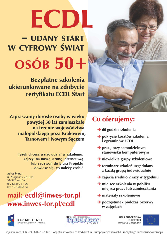 Firma FHU "Inwes.tor" zaprasza wszystkie osoby w wieku 50-64 lat zamieszkałe na terenie województwa małopolskiego (poza Krakowem, Tarnowem i Nowym Sączem) na bezpłatne (finansowane w całości ze środków Unii Europejskiej i budżetu państwa) szkolenia z zakresu podstaw obsługi komputera zakończone uzyskaniem międzynarodowego certyfikatu ECDL.