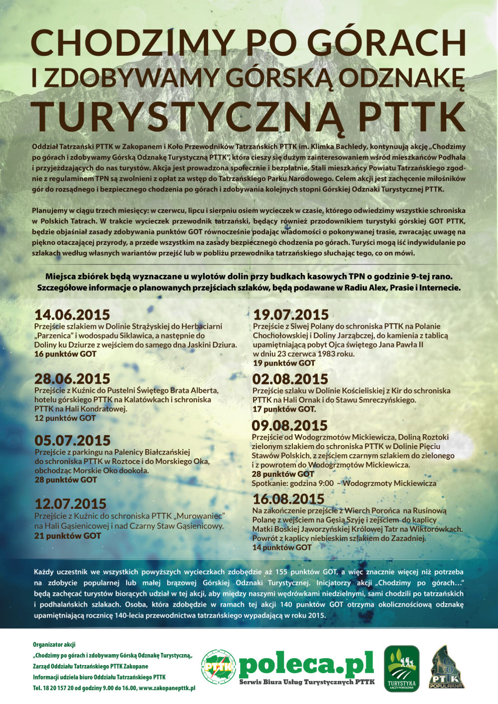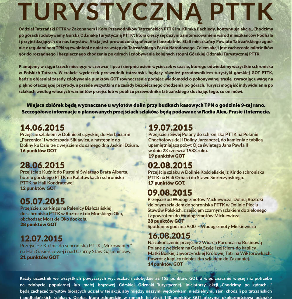 Oddział Tatrzański PTTK w Zakopanem i Koło Przewodników Tatrzańskich PTTK im. Klimka Bachledy, kontynuują akcję „Chodzimy po górach i zdobywamy Górską Odznakę Turystyczną PTTK”, która cieszy się dużym zainteresowaniem wśród mieszkańców Podhala i przyjeżdżających do nas turystów. Akcja jest prowadzona społecznie i bezpłatnie. Stali mieszkańcy Powiatu Tatrzańskiego zgodnie z regulaminem TPN są zwolnieni z opłat za wstęp do Tatrzańskiego Parku Narodowego.