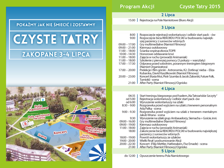 W dniach 3-4 lipca 2015 rusza kolejna w Zakopanem Akcja Czyste Tatry organizowana przez Stowarzyszenie Czysta Polska. Wolontariusze, Partnerzy i Ambasadorzy akcji - muzycy, sportowcy i aktorzy ruszą na tatrzańskie szlaki, żeby oczyścić je ze śmieci i zachęcić turystów do współpracy w ramach ekologicznej edukacji.