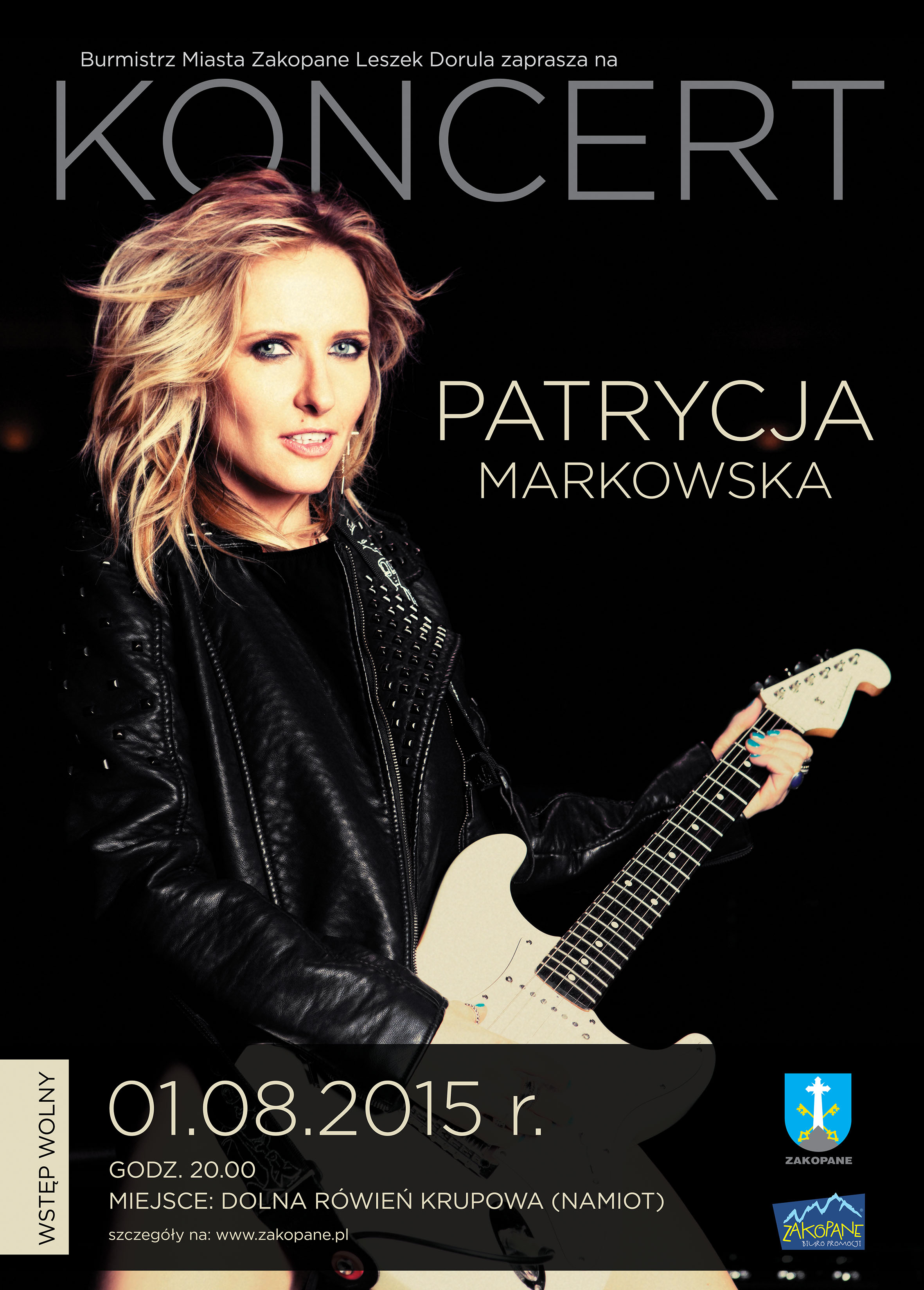 Burmistrz Miasta Zakopane Leszek Dorula zaprasza mieszkańców i turystów na koncert Patrycji Markowskiej, który odbędzie się 1 sierpnia 2015 r. o godz. 20.00 w namiocie na Dolnej Równi Krupowej.