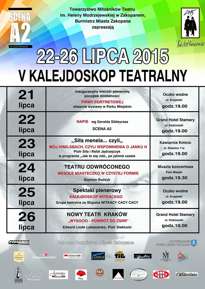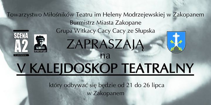 Towarzystwo Miłośników Teatru im. Heleny Modrzejewskiej - Scena A2 oraz Burmistrz Miasta Zakopane Leszek Dorula zapraszają na KALEJDOSKOP TEATRALNY 2015.