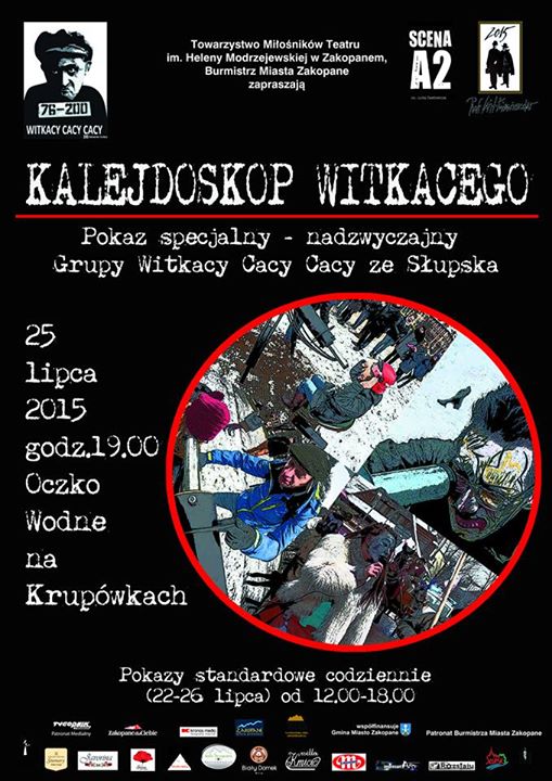W dniach 22 – 26 lipca w godz. 12.00 – 18.00 przy Oczku Wodnym na Krupówkach odbędą się prezentacje kalejdoskopowe – niespodzianki w wykonaniu Słupskiej Grupy Teatralnej Witkacy Cacy Cacy i aktorów SCENY A2.