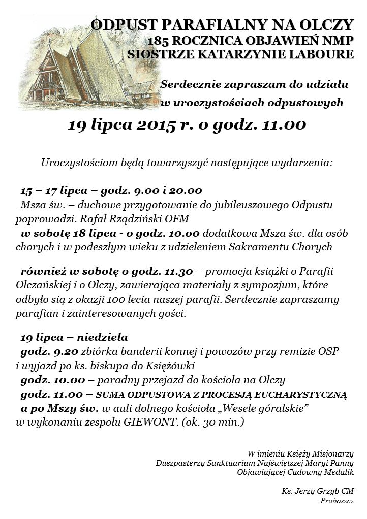 19 lipca z okazji Odpustu Parafialnego w Sanktuarium MB Objawiającej Cudowny Medalik na Olczy, Zakopane odwiedził Arcybiskup Tadeusz Gocłowski. Uroczyście przyjął go gospodarz miasta Burmistrz Leszek Dorula oraz Wicestarosta Tatrzański Jerzy Zacharko. Konnymi powozami w asyście banderii konnej przejechali wspólnie z Księżówki do Kościoła na Olczy gdzie odbyły się Odpust Parafialny i obchody 185. Rocznicy Objawień Najświętszej Maryi Panny Siostrze Katarzynie Laboure.