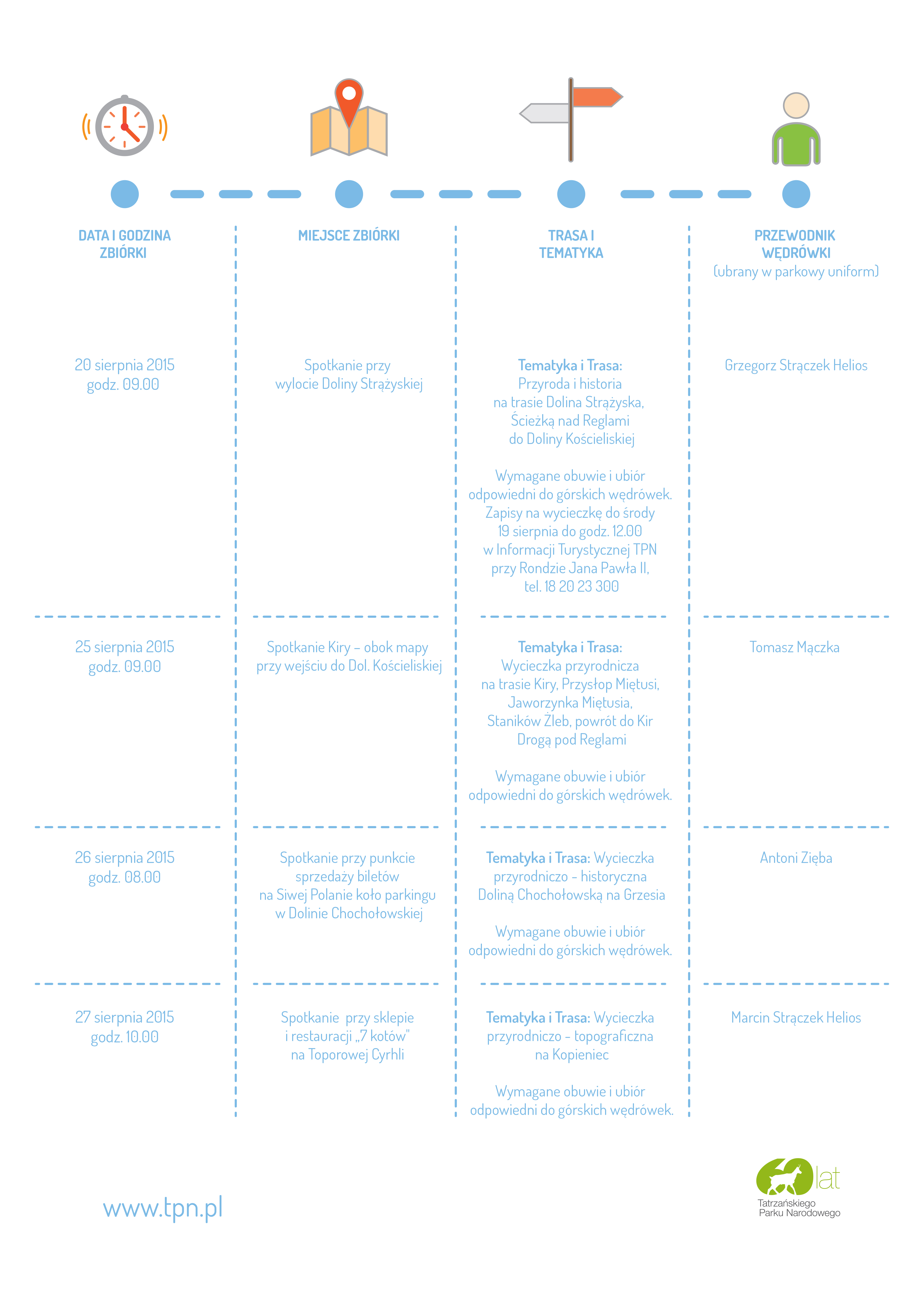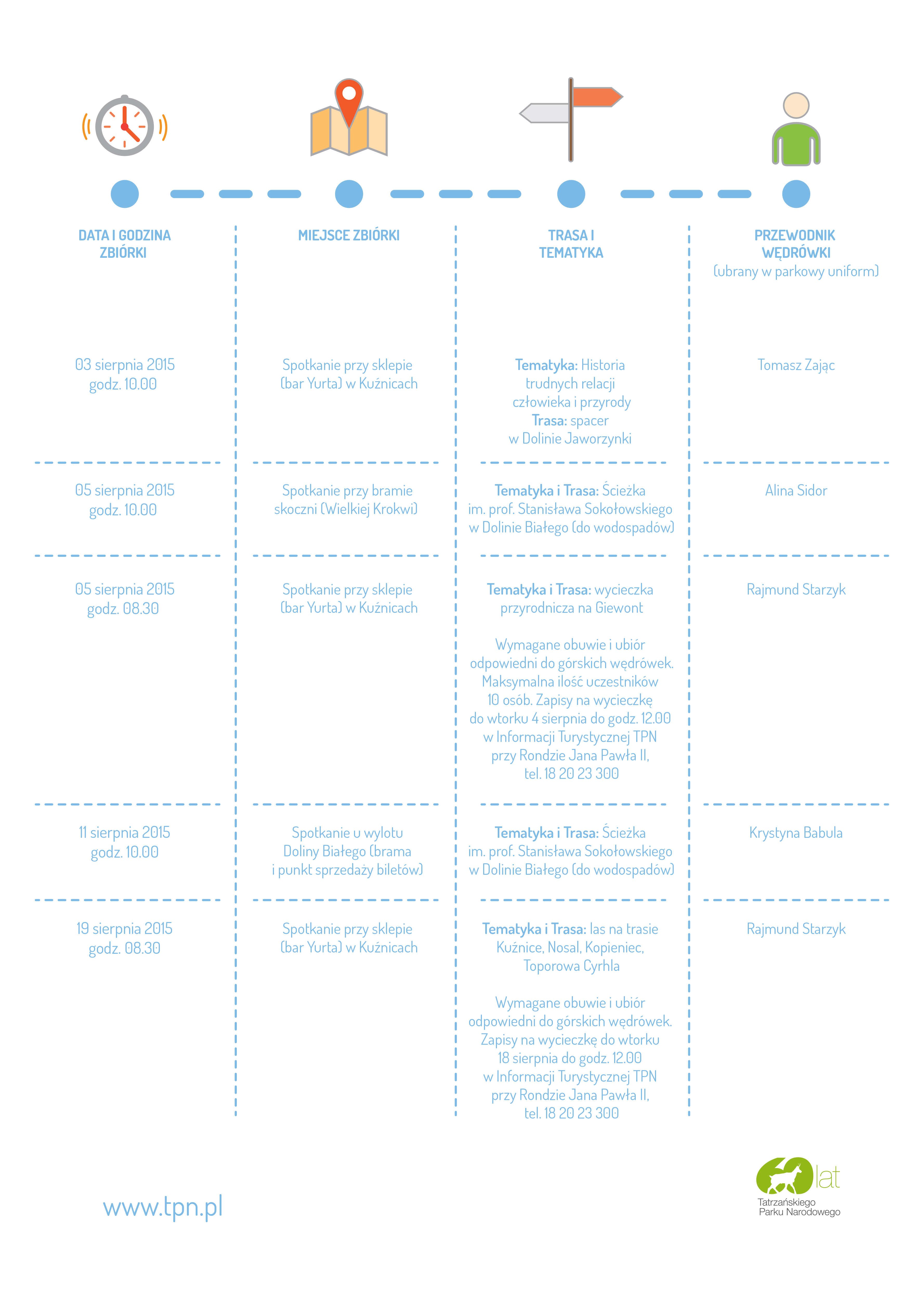 Dodatkowe informacje o poszczególnych wyprawach (godziny, konieczność wcześniejszych zapisów, ew. limity miejsc) będą zamieszczone w osobnych komunikatach i ogłoszeniach na stronach TPN-u.