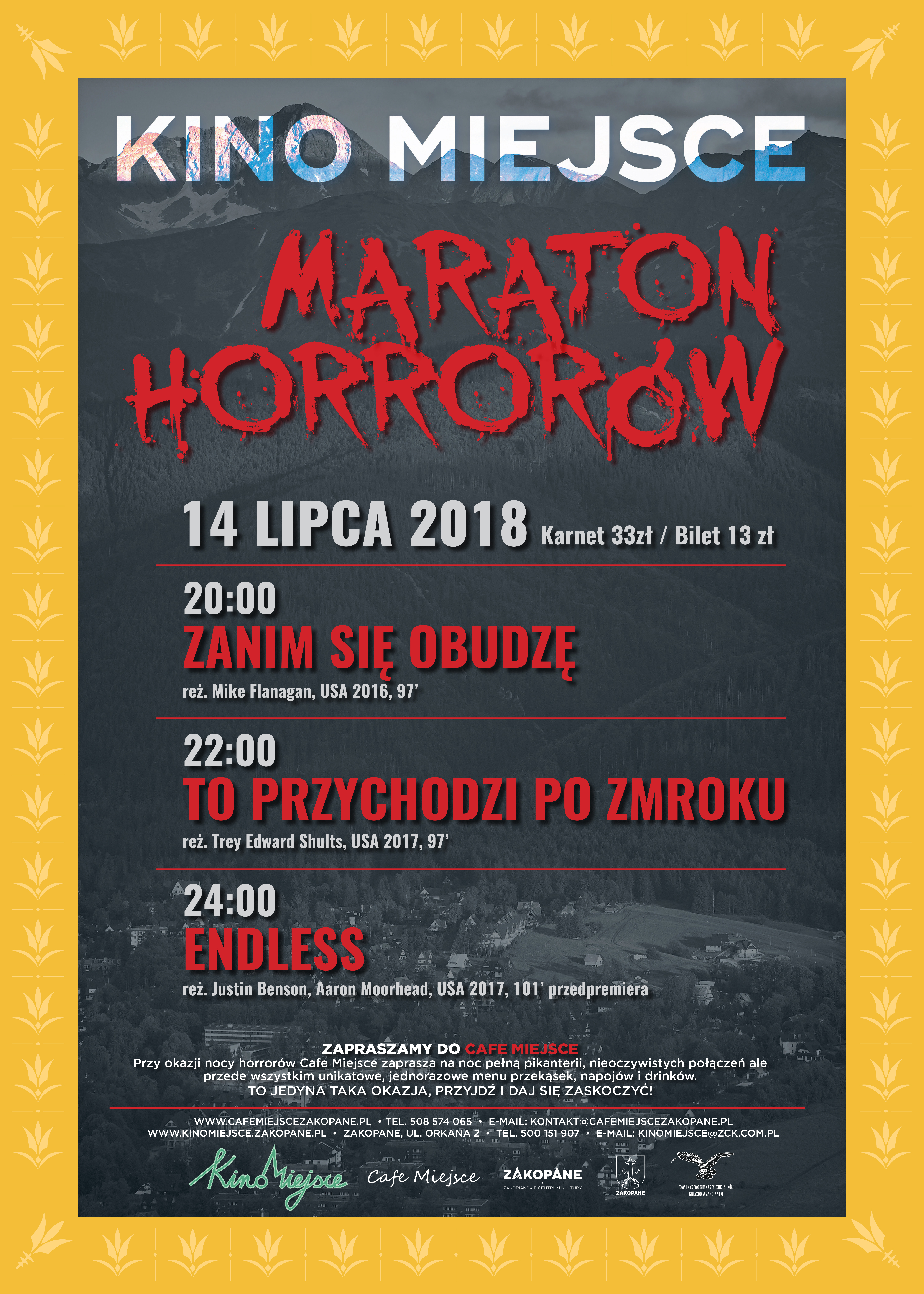 Kino miejsce zaprasza na wakacyjny Maraton Horrorów. 14 lipca od godziny 20.00. W programie: "Zanim się obudzę" (reż. Mike Flanagan), "To przychodzi po zmroku" (reż. Trey Edward Shults), "Endless" (reż. Justin Benson)