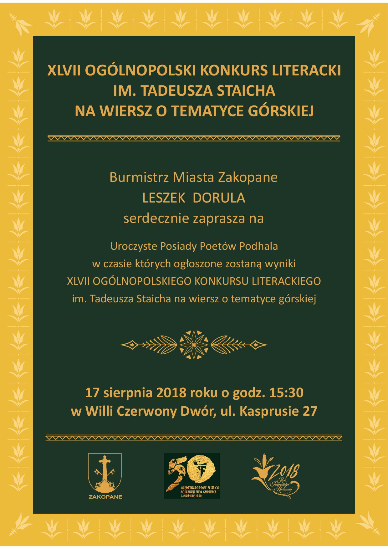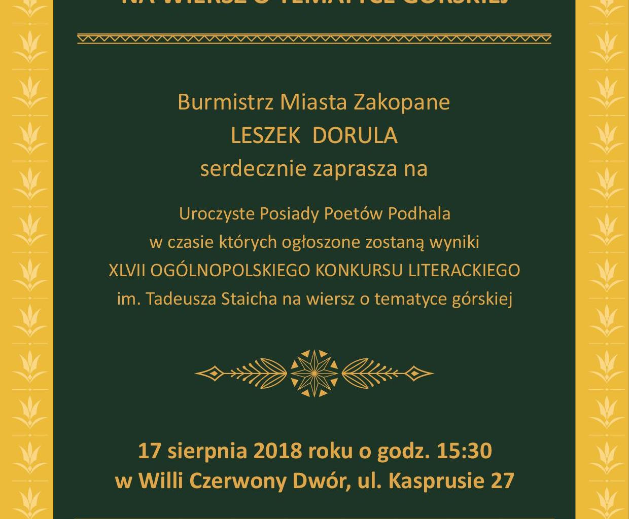 Burmistrz Miasta Zakopane Leszek Dorula zaprasza na Uroczyste Posiady Poetów Podhala, w czasie których ogłoszone zostaną wyniki XLVII Ogólnopolskiego Konkursu Literackiego im. Tadeusza Staicha na wiersz o tematyce górskiej. 17 sierpnia o godz. 15.30, Willa Czerwony Dwór, ul. Kasprusie 27.