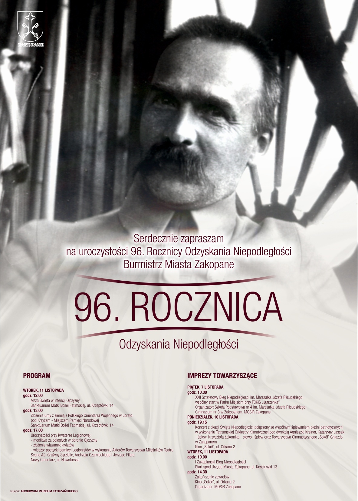 Burmistrz Miasta Zakopane zaprasza na uroczystości 96. Rocznicy Odzyskania Niepodległości w dniu 11 listopada br. Zachęcamy do zapoznania się z ich programem oraz z planowanymi imprezami towarzyszącymi.