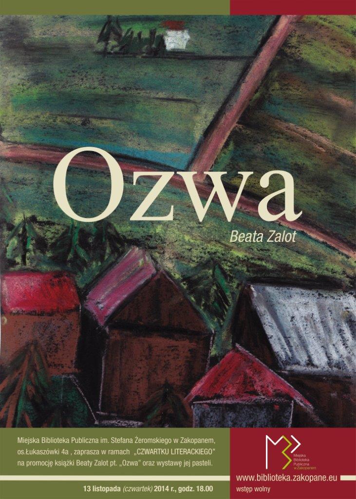 Już jutro we czwartek, 13 listopada o godz. 18.00, w czytelni Miejskiej Biblioteki Publicznej odbędzie się promocja najnowszej książki Beaty Zalot pt. „Ozwa”. Prezentacji książki towarzyszyć będzie wystawa pasteli.