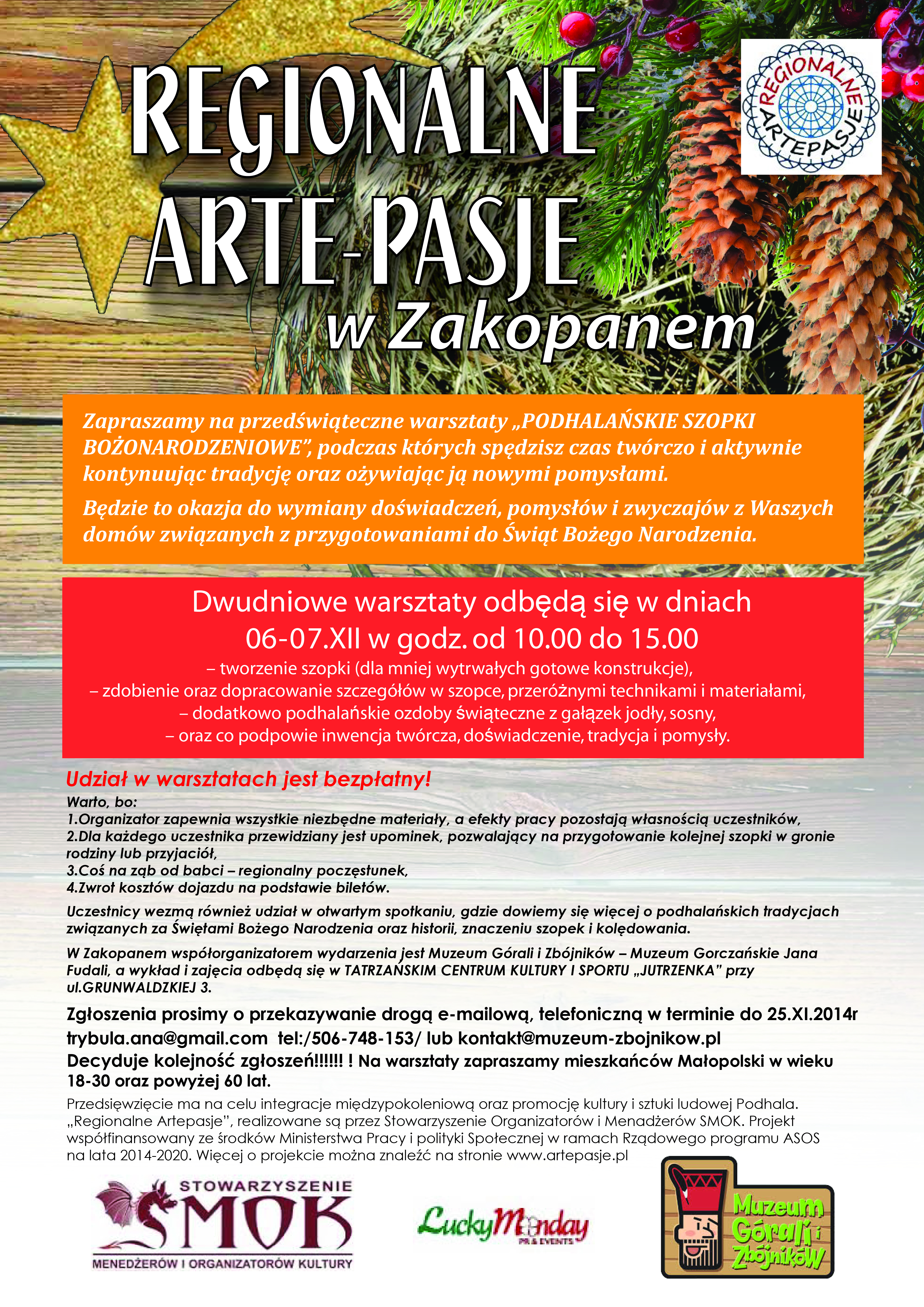 Przedsięwzięcie ma na celu integracje międzypokoleniową oraz promocję kultury i sztuki ludowej Podhala. „Regionalne Artepasje”, realizowane są przez Stowarzyszenie Organizatorów i Menadżerów SMOK. Projekt współfinansowany ze środków Ministerstwa Pracy i polityki Społecznej w ramach Rządowego programu ASOS na lata 2014-2020. Więcej o projekcie można znaleźć na stronie www.artepasje.pl