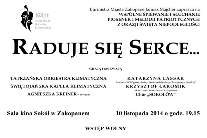Burmistrz Miasta Zakopane z okazji Święta Niepodległości serdecznie zaprasza 10 listopada o godz. 19.15 do kina „Sokół” na wspólne śpiewanie pieśni patriotycznych, które poprowadzi Tatrzańska Orkiestra Klimatyczna wraz z solistami Katarzyną Lassak i Krzysztofem Łakomikiem oraz członkowie Towarzystwa Gimnastycznego „Sokół”.