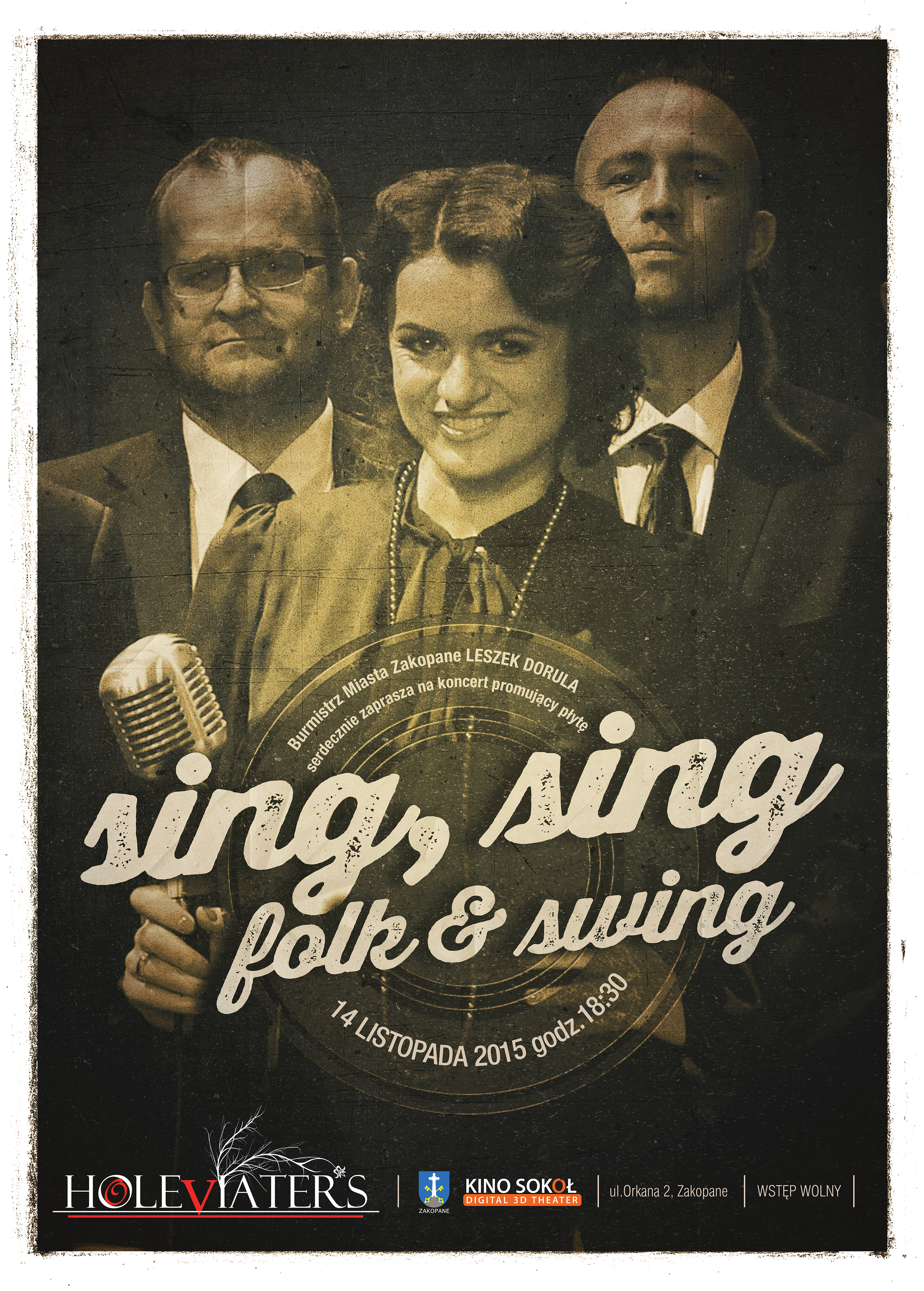 Burmistrz Miasta Zakopane Leszek Dorula, w podziękowaniu za przygotowanie sezonu letniego i za gościnne przyjęcie turystów serdecznie zaprasza przedsiębiorców i mieszkańców Zakopanego 14 listopada o godz. 18.30 do Kina "Sokół" ul. Orkana 2 na koncert zespołu Holeviaters promujący płytę "sing sing, folk i swing". W miłej atmosferze będzie można zrelaksować się przy muzyce folk z brzmieniem swingowych standardów i jazzowych ballad, ale i również pozytywnie nastawić się do przygotowań na sezon zimowy, który już niebawem rozpoczniemy Zakopiańskimi Mikołajkami.