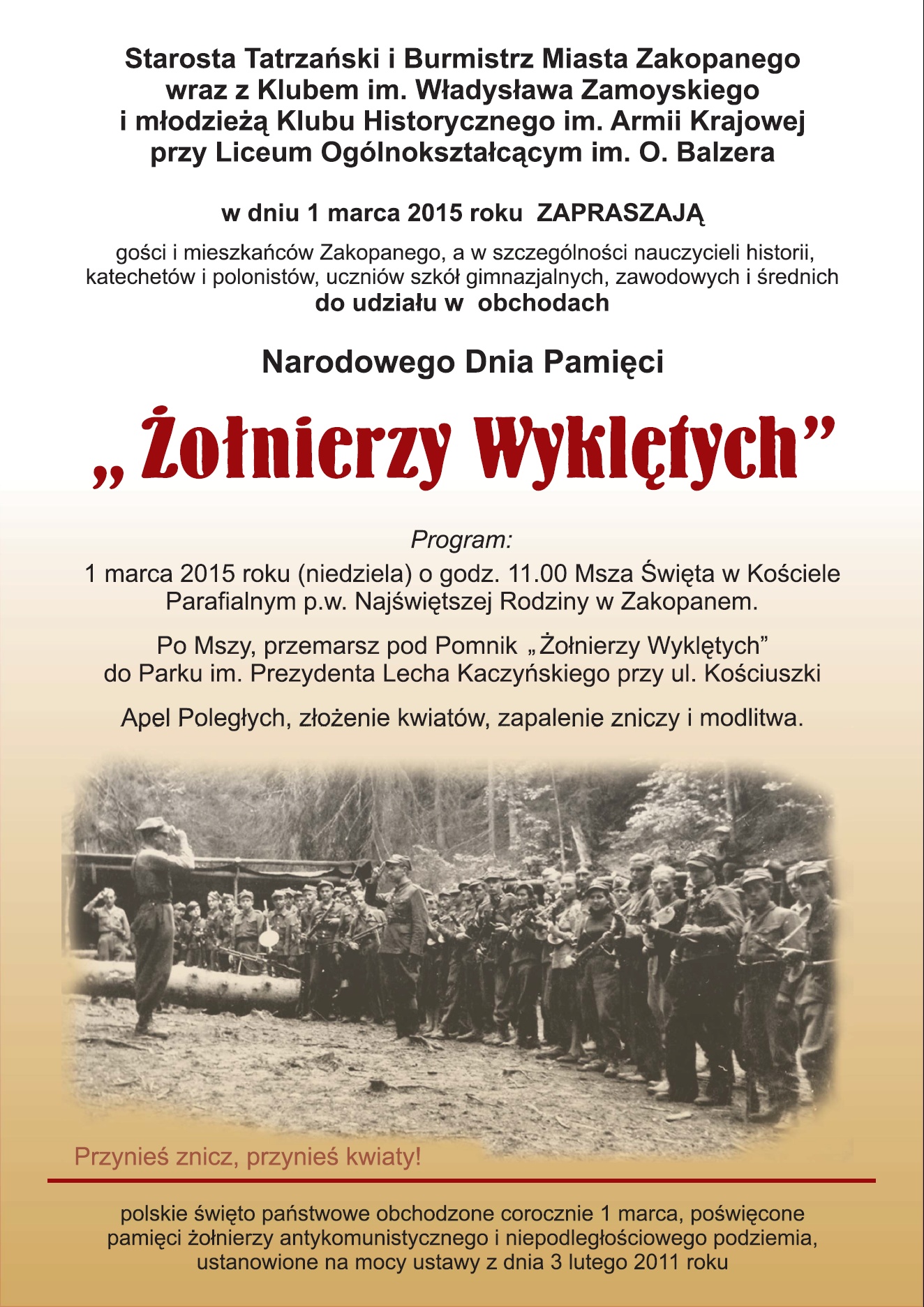 Starosta Tatrzański i Burmistrz Miasta Zakopane wraz z Klubem im. Wł. Zamoyskiego i młodzieżą Klubu Historycznego im. Armii Krajowej przy Liceum Ogólnokształcącym im. O. Balzera zapraszają na uroczystości 1 marca 2015 roku od godz. 11.00.