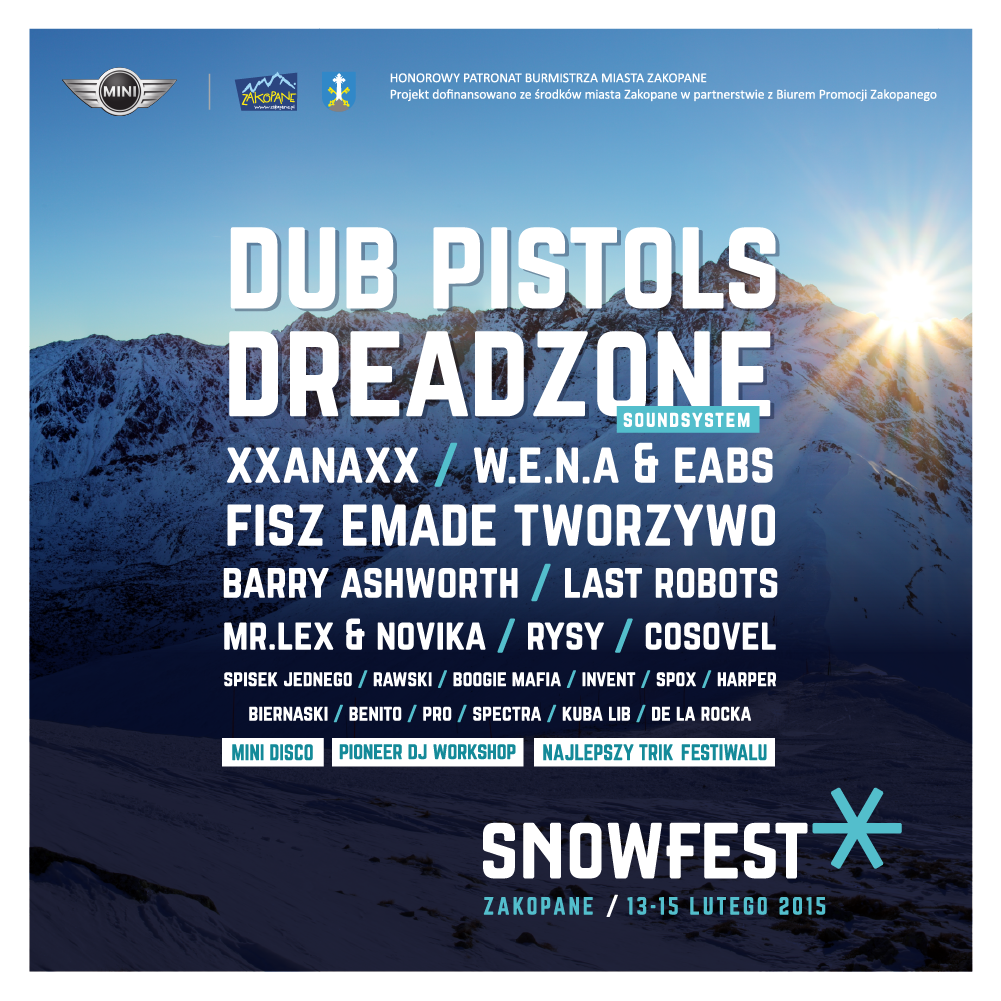 Znamy już pełny line-up tegorocznej edycji festiwalu SnowFest, który odbędzie się w Zakopanem w dniach 13-15 lutego. Podczas wydarzenia wystąpią m.in.: brytyjska grupa Dub Pistols, legendarny brytyjski soundsystem Dreadzone, W.E.N.A. z muzykami Electro-Acoustic Beat Session, Fisz i Edmade, oraz zespoły: Xxanaxx, Rysy i Cosovel. Na festiwlu nie zabraknie również występów czołowych dj-ów oraz producentów sceny elektronicznej w składzie: Barry Ashworth, Last Robots, Novika & Mr. Lex, Invent, Spisek Jednego, Rawski, Boogiemafia, Harper, Benito, Kuba Lib, Spectra, Biernaski, Spox czy De La Rocka.