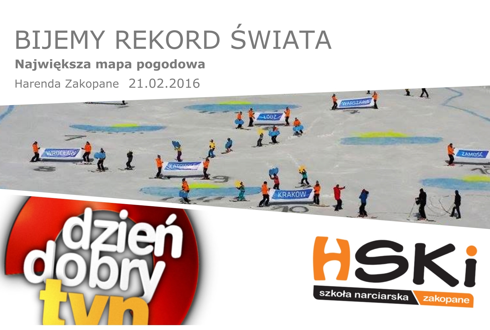 Zapraszamy rodziny z całej Polski do uczestnictwa w biciu rekordu świata - największej mapie pogodowej, w niedzielę 21 lutego o godz. 9.00 na Harendzie. Każdy z Was będzie tworzył to wielkie wydarzenie. Przyjdźcie i napiszcie na mapie skąd jesteście.