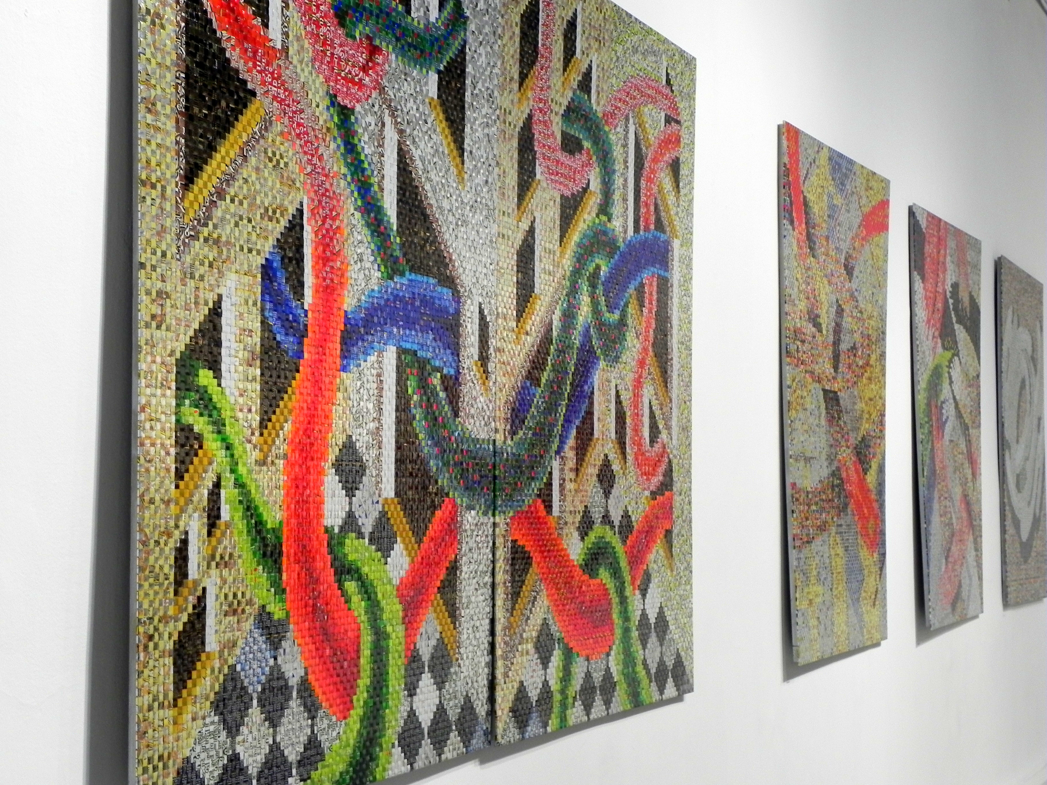 Na wystawie możemy podziwiać obrazy artysty powstające przez mechaniczną destrukcję puszek do postaci uformowanego jakby „tkanego” kolażu. Wykorzystuje on jednocześnie prosty schemat: puszki (slangowo „piksel”) przemieniane są w mozaikowy kolaż wyglądający na tekstylną tkaninę lub rozpikselowany obraz.