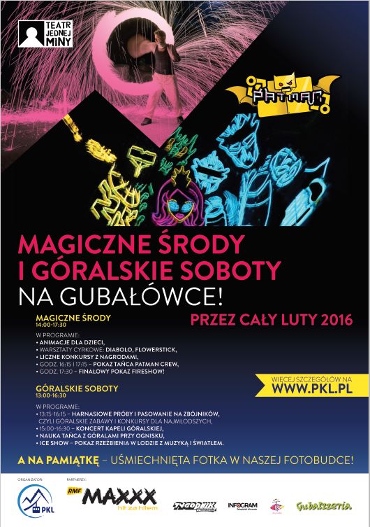 Przez cały luty, w każdą środę i sobotę, zapraszamy na Gubałówkę, gdzie czekać będzie na wszystkich mnóstwo atrakcji. W programie m.in.: animacje dla dzieci, magiczne tańce, szczudlarze, zabawy gigantyczną skakanką, warsztaty cyrkowe: diabolo oraz flowerstick, żonglerka akrylową kulą oraz liczne konkursy z nagrodami.