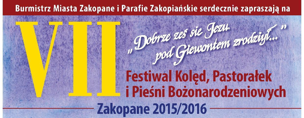 Burmistrz Miasta Zakopane Leszek Dorula i Parafie Zakopiańskie zapraszają na VII Festiwal Kolęd, Pastorałek i Pieśni Bożonarodzeniowych "Dobrze ześ sie Jezu pod Giewontem zrodziył..."