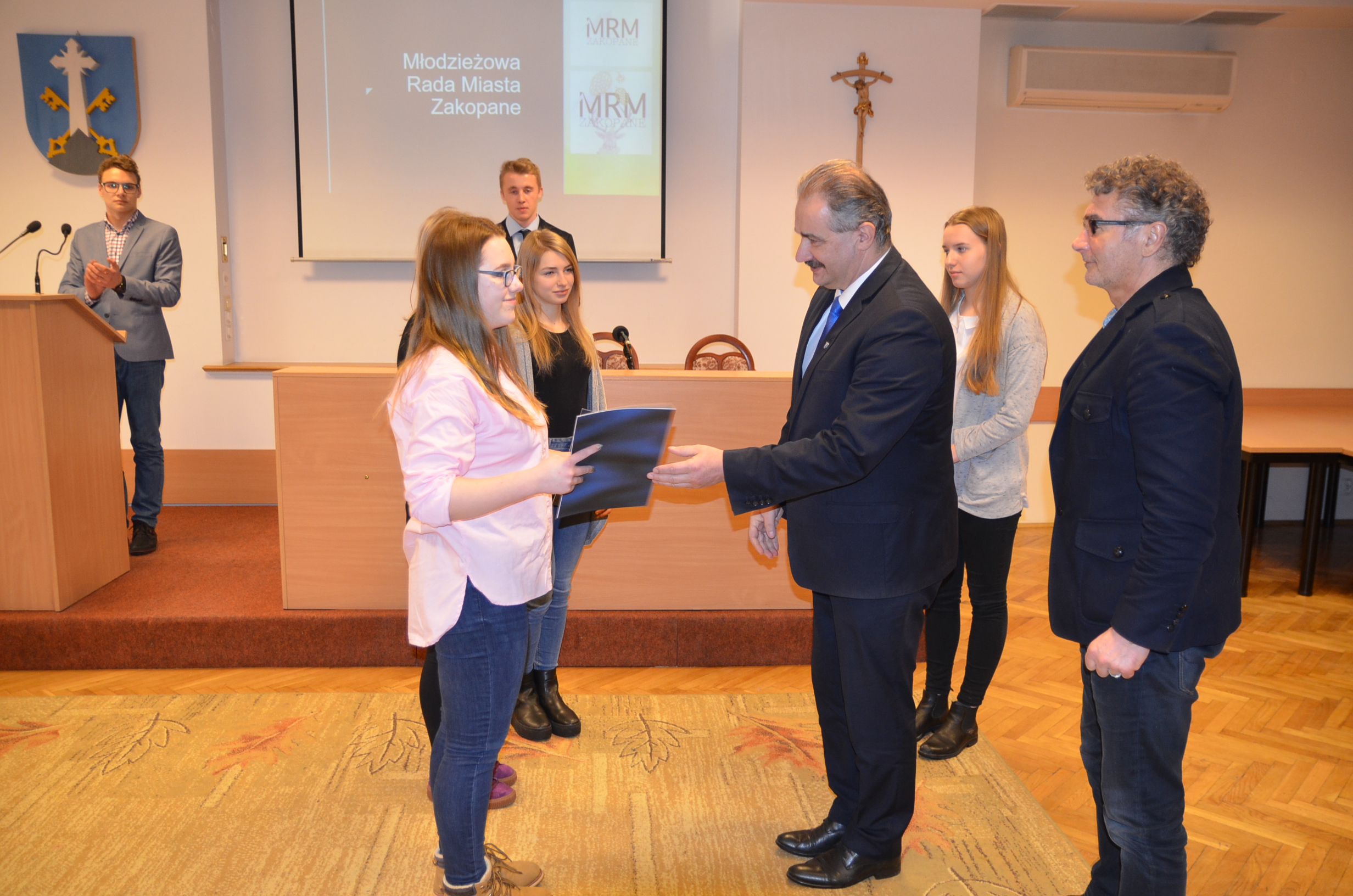 Na sesji nie zabrakło przedstawicieli zakopiańskich szkół, którym sekretarz Rady Julia Dziedzic przedstawiła prezentację multimedialną przedstawiającą model funkcjonowania Młodzieżowych Rad oraz działania planowane i te już podjęte przez młodzież. Część projektów została zapoczątkowana przez radnych minionej kadencji, którzy w dniu wczorajszym reprezentowani byli przez byłe prezydium Młodzieżowej Rady Miasta: Kamila Nowaka, Natalię Kmiecik i Justynę Lasiak.