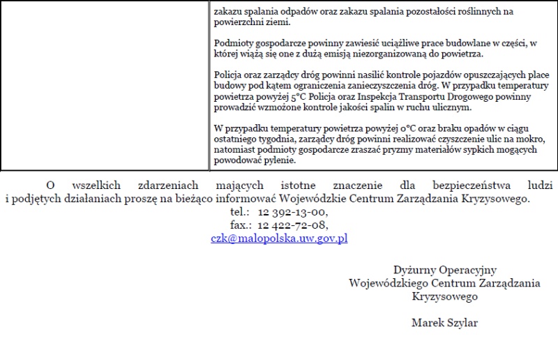 Wojewódzki Zespół Zarządzania Kryzysowego wprowadza II stopień zagrożenia zanieczyszczeniem powietrza i ostrzega o ryzyku przekroczenia poziomu informowania dla stężenia 24-godzinnego pyłu PM10 oraz związanego z nim wysokiego stężenia pyłu PM2,5 oraz benzo(a)pirenu w powietrzu.